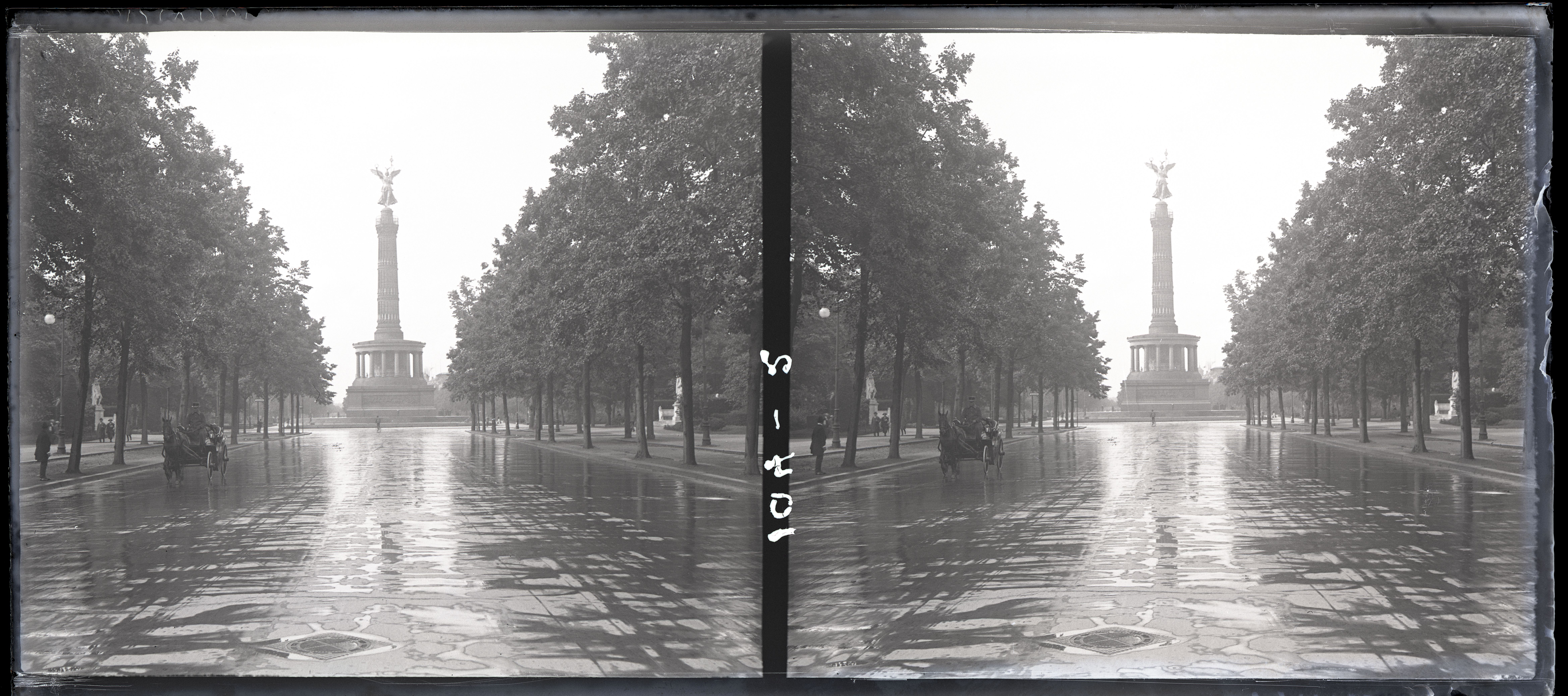 Stereoskopisk glasdias. Ligger i en æske med påskriften: "Berlin-Dresden 1921. % 104.". På æsken er påklistret teksten: "Ilford Alpha Lantern Plates ". Æsken har nummer ”S48”.