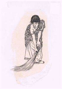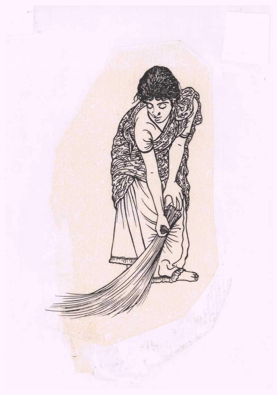 The drawing illustrates a young woman wearing a half sari common for unmarried women in the fishing community in Tranquebar in 1981. The half sari consists of a skirt and a long piece of cloth arranged as a sash. She is wiping the floor with a broom made of coconut leaves. In 1985 artist Elsebet Morville produced a series of fourteen drawings for ethnographer Esther Fihl in relation to her fieldwork in Tranquebar in 1981. This drawing is made according to Fihl’s photos and notes.