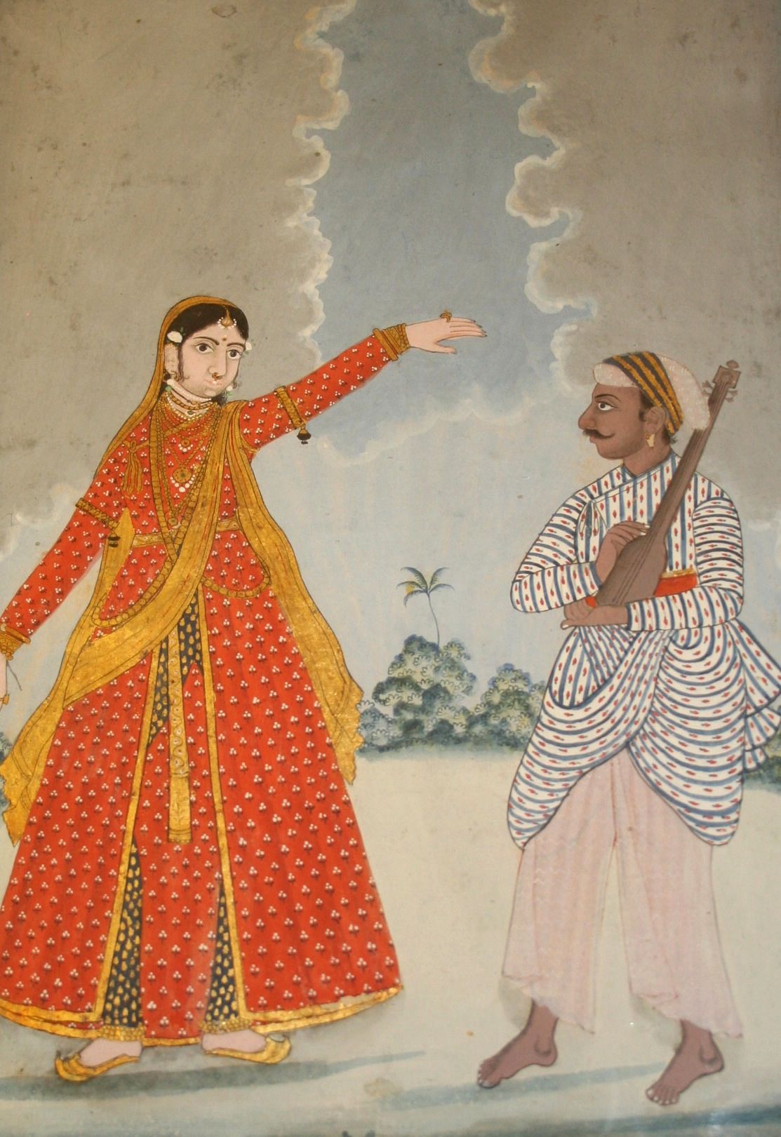 Named: "A female Muslim danser. Musician with the instrument sarangi" in the museum register. One of a series of miniature paintings depicting a wide range of different occupations, trades and castes in the late eighteenth century. The paintings are in the style known as company paintings, a unique artistic tradition which artists at the royal court in Thanjavur played quite an impressive role in developing. The paintings portray local people, plants, birds, festivals and working scenes and were made to be bought as souvenirs by civil servants employed by the European trading companies. Particularly popular were series with motifs of different castes and occupations depicting husband and wife together with an emphasis on typical tools and differences in costume. These paintings of everyday Indian life may of course be interpreted as a reflection of European attempts to understand the culturally complex Indian society through classification and categorisation. However, being naturalistic yet rather exotic depictions, they may also be seen as an expression of a desire in royal Indian patrons and artists to portray India in a manner comprehensible to the Western eye and present local folklife in an aesthetic way.