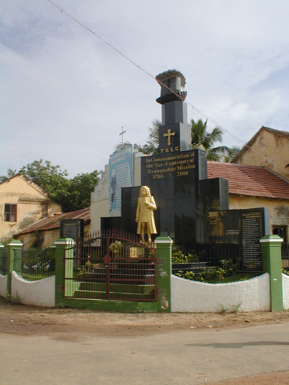Forgyldt statue af missionæren Ziegenbalg opstillet ved Paradepladsen i Tranquebar i 2006. Fotoet er taget under etnografen Nils-Finn Munch Petersen feltarbejde i Tranquebar fra oktober 2006 til slutningen af januar 2007. På baggrund af dette feltarbejde lavede Nils Finn Munch-Hansen en turismeanalyse af Tranquebar med henblik på at skabe nye arbejdspladser for lokalbefolkningen gennem udviklingen af en bæredygtig turismeplan.