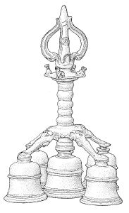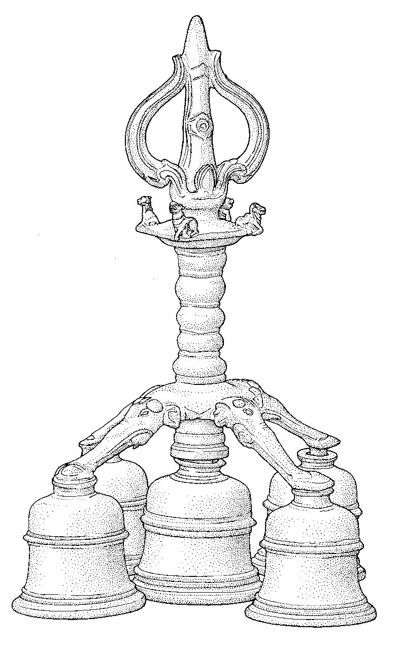 As part of the Tranquebar Initiative (2004-2016) of the National Museum of Denmark, Dr Ramachandran Nagaswamy, former Commissioner of Archaeology in Tamil Nadu, worked in 2006 at the National Museum to describe and analyse this and other bonze items from the Peter Anker collection from Tranquebar. Nagaswamy noted on this item (museum no. Da-173): "A Bunch of bells (Maha ghanta, also some times called Kottu mani) of five bells with four elephant trunks. Are commonly seen in temples particularly from the Chola age. Such a Great bell found in this find is interesting. There are four elephant faces with stretched trunks from the handle in four directions at the end of which are fastened four bells and the fifth is hung in the middle of them making it a bunch of five. The bells are rivetted to the trunks and are provided with tongs that are made of bronze but hung by rings. Above the bells is a handle with the same small kalasa design found in the ornate vessel. Above them is a square plate topped by a trident trisula that indicates the bell belongs to a Saiva temple. The plate supporting the Trident has four Nandis bulls at the four corners. The top trident shows that the bell was to be sounded with hand during the main ritual."