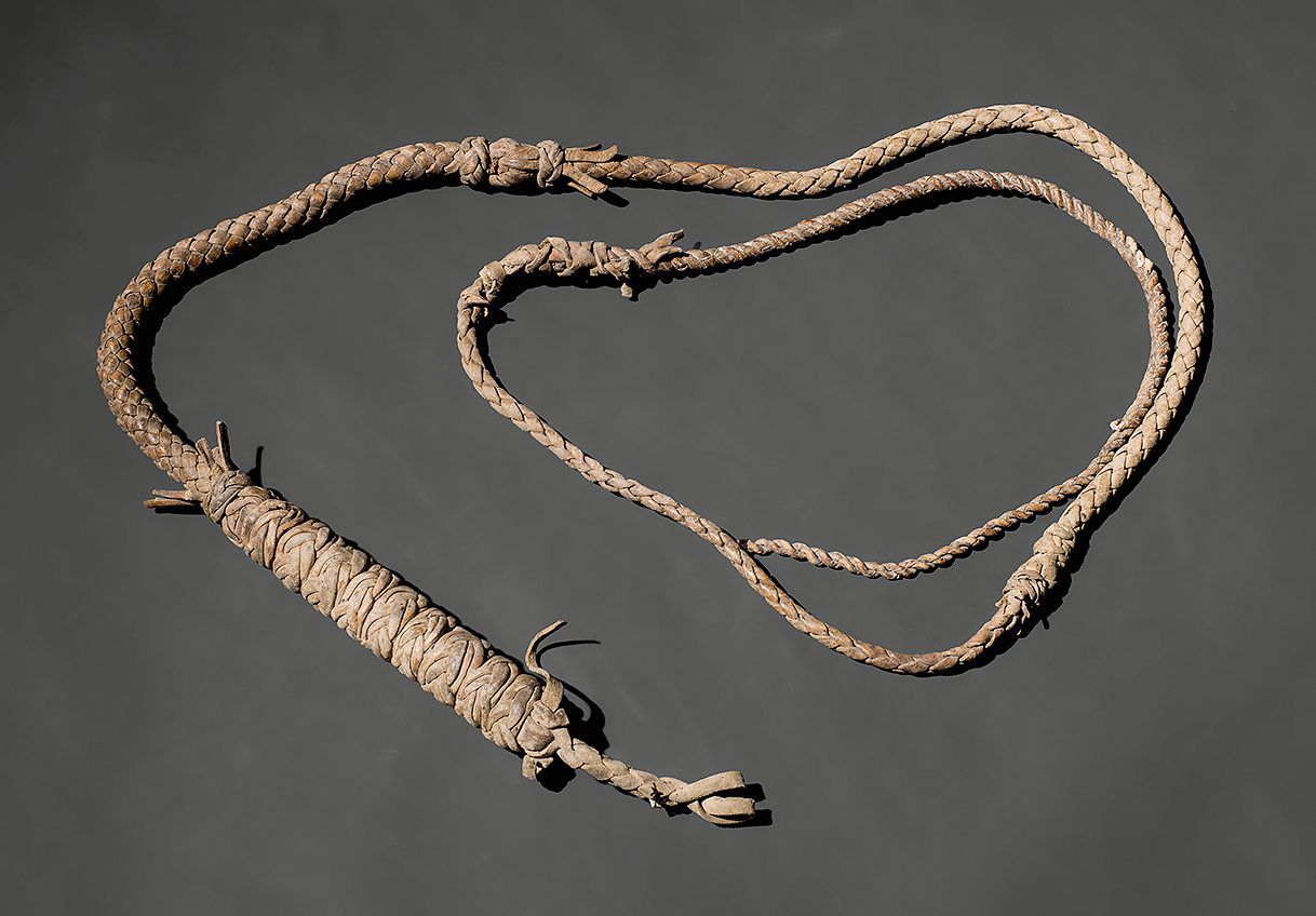 Camel whip made of tightly braided leather straps. The whip lash is composed of four succes sive braided straps tied together with Turkish knots, each part progressively thinner towards the end of the whip. The handle has a kernel of bamboo, thickly wound with extra layers of braided leather straps.