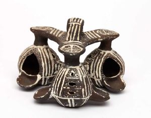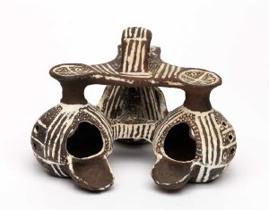 "Tredelt røgelsesbrænder af brændt ler med hvid påmalet dekoration. (Verbal beskrivelse)"