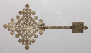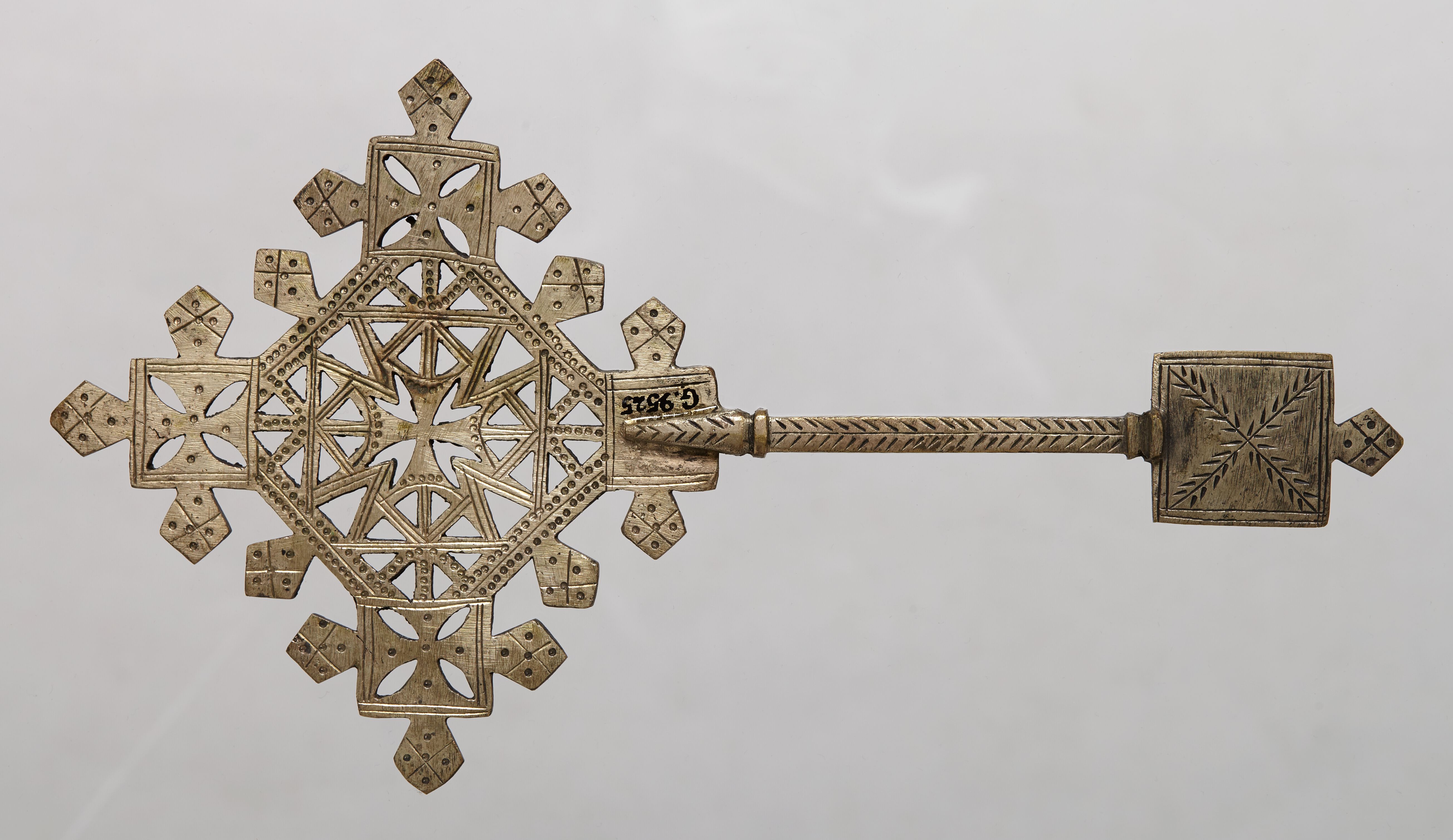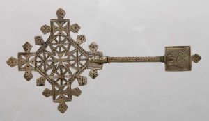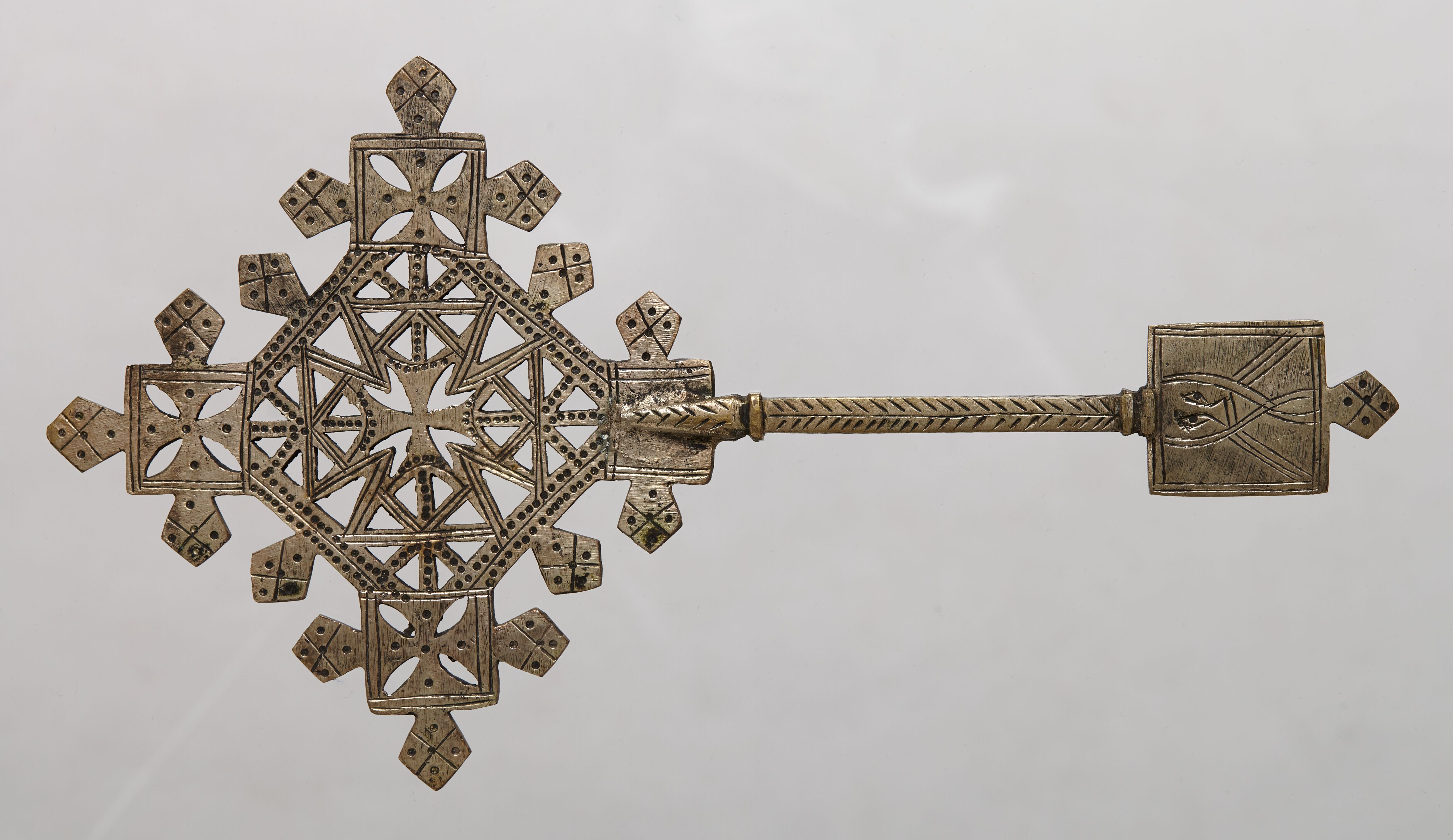 "Præstekors af sølvfarvet metal med gennembrudt dekoration og meget stiliseret ansigt på pladen for enden af skaftet.Giver har købt korset af en præst i Addis Abeba. (Verbal beskrivelse)",