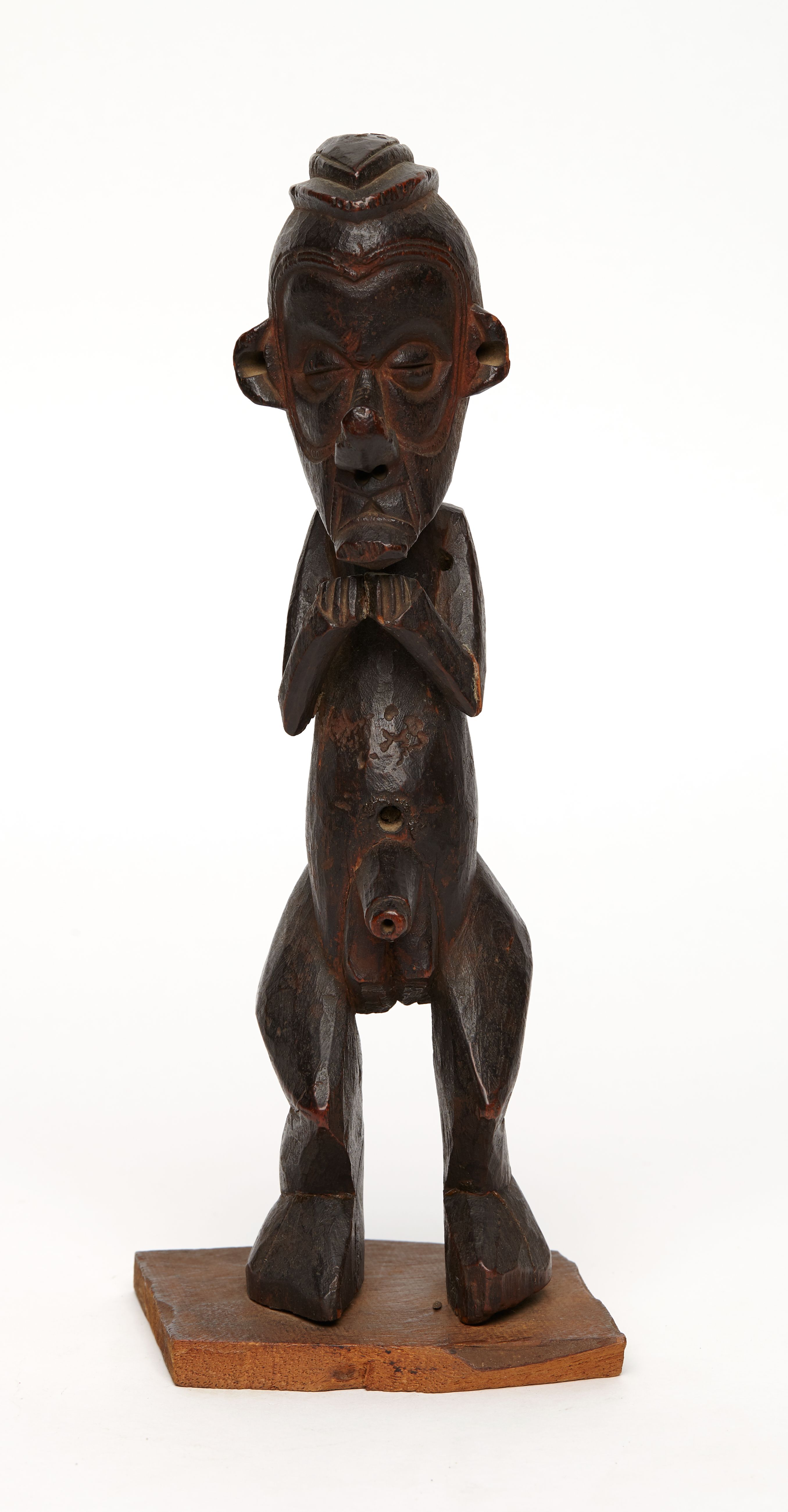 "Stående mandsfigur med hænderne samlet foran hagen. (Verbal beskrivelse)"