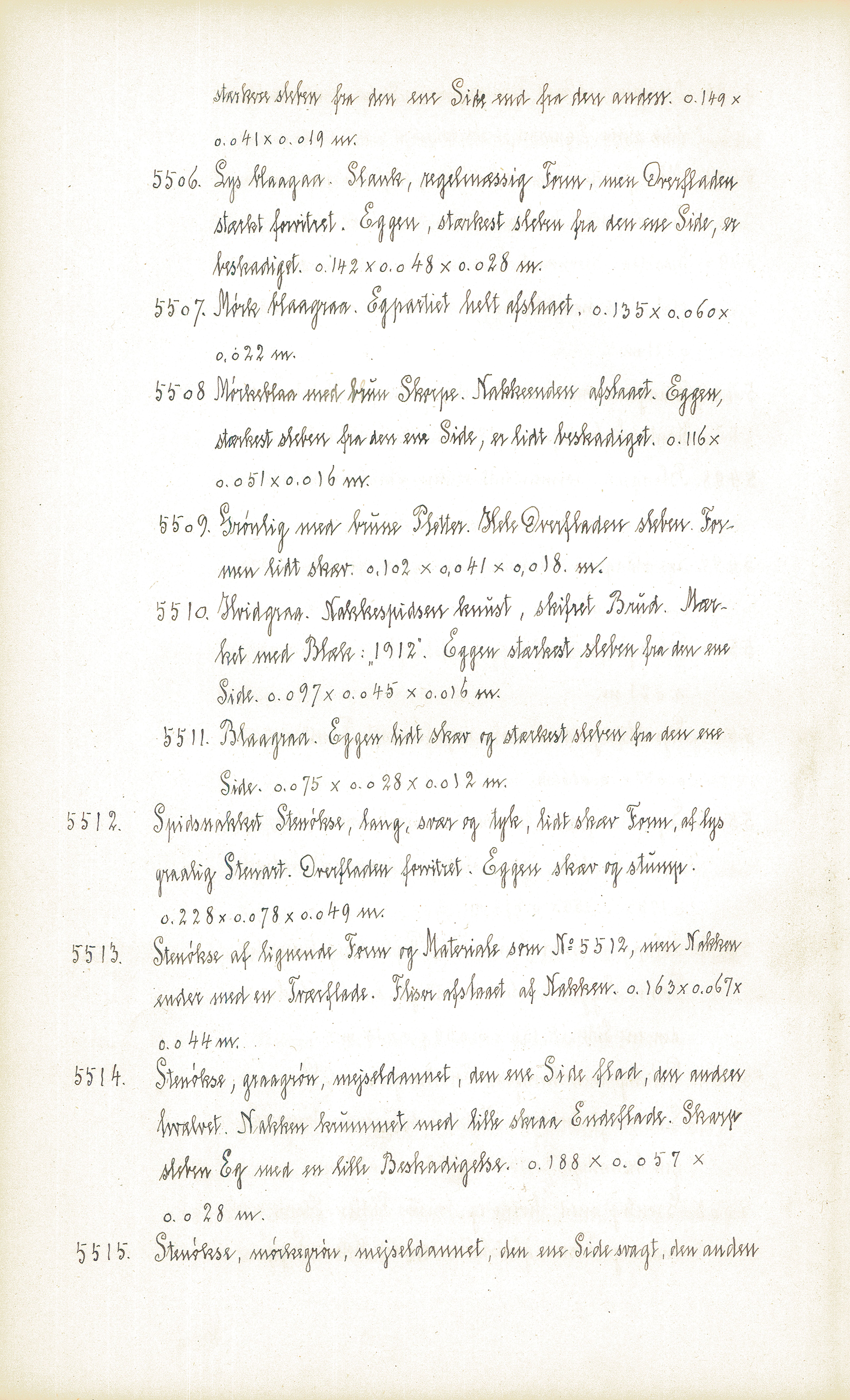 "beskrivelse": "Protokol oldsager O.5474-5564 - Protokoltekst: \"Ifølge mundtlig Meddelelse fra Fru Rübner-Petersen er Sagerne saa vidt hun ved, alle indsamlede paa Sct. Croix. I hvert fald er de alle fra Dansk Vestindien.\" Indsamlingstidspunkt ukendt, men ikke senere end til og med 1920.",