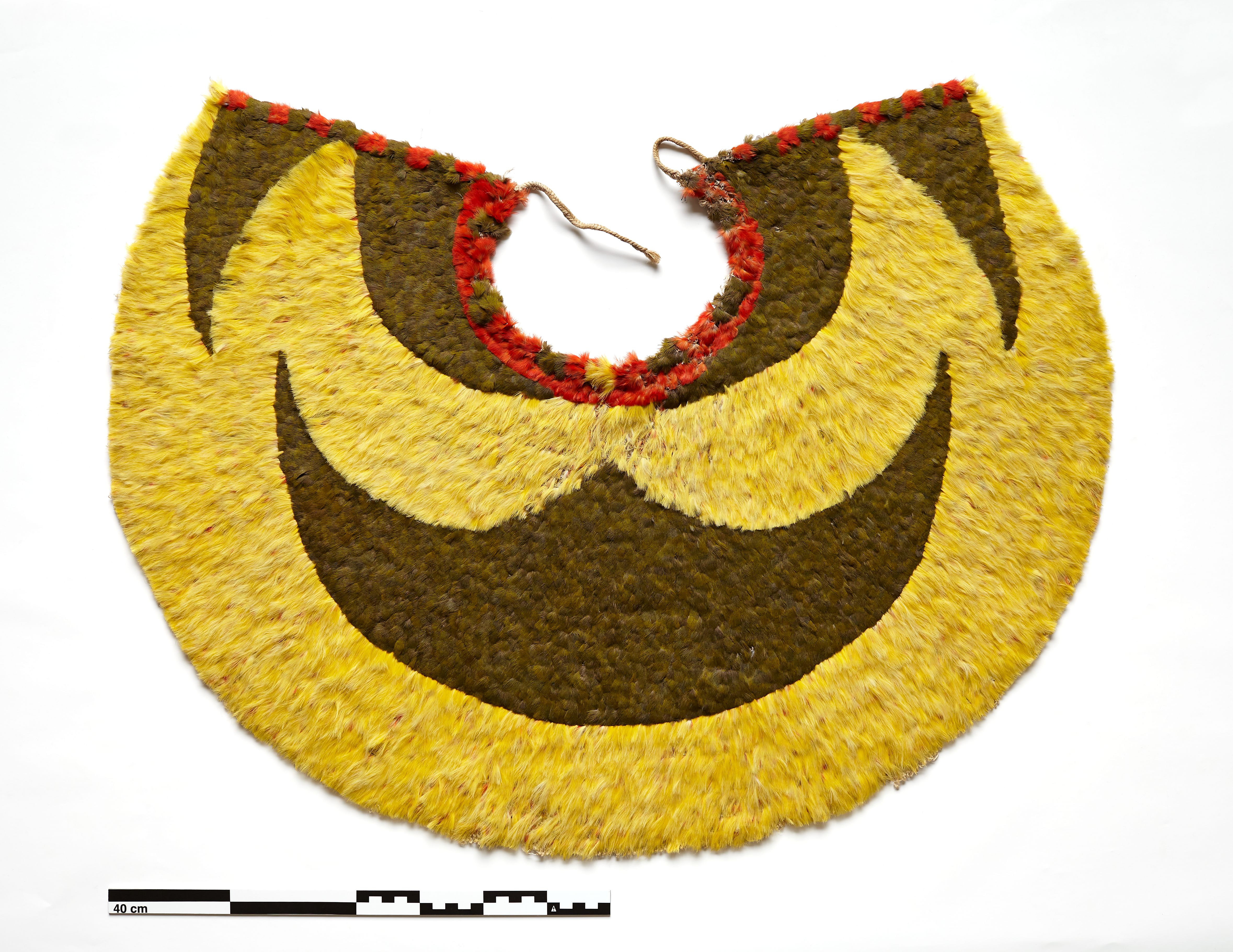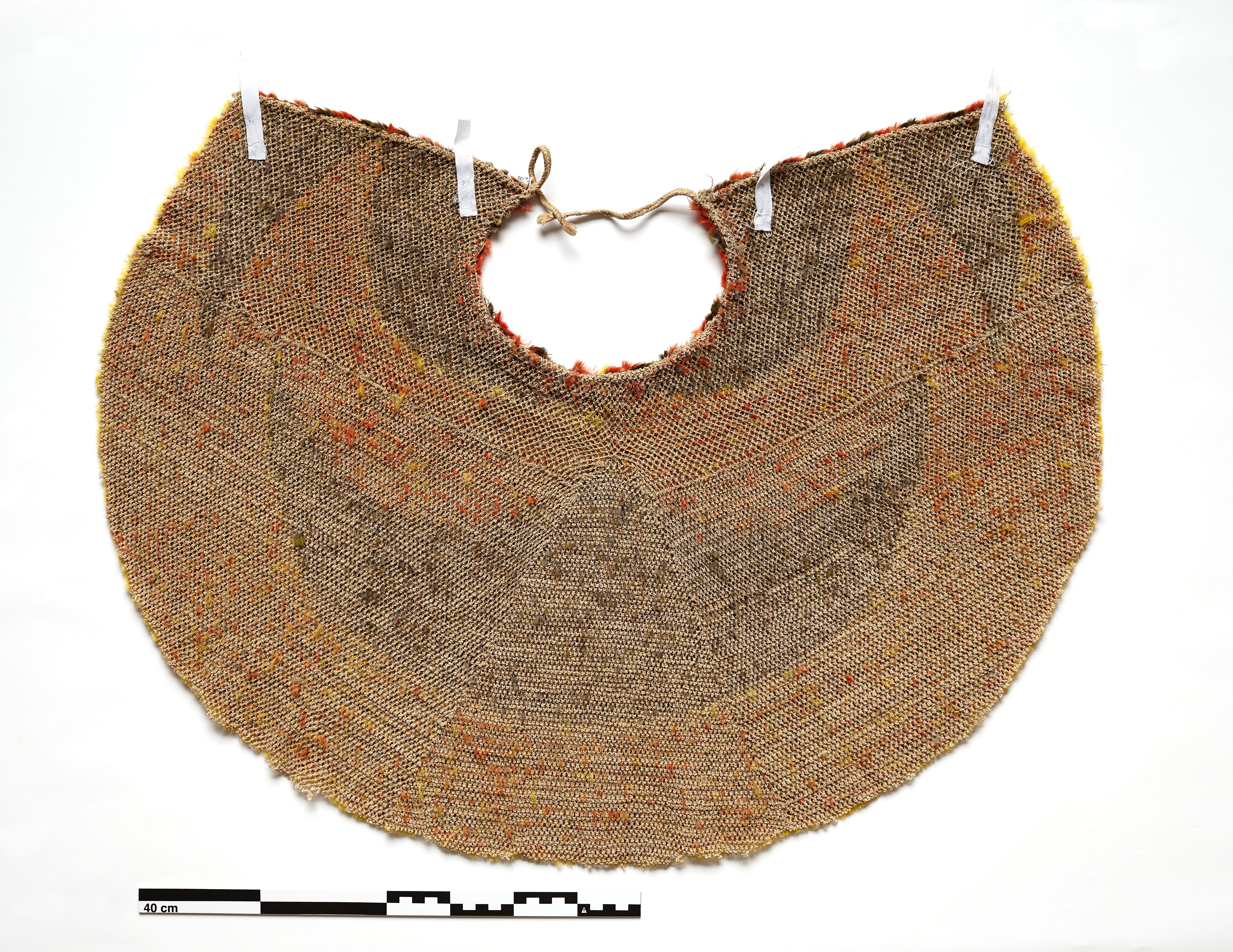 "Fjer indknyttet i net i geometrisk mønster. Som et afrundet, bredt skulderslag. (Dekorativ teknik)"