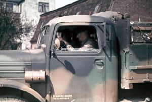Lastbiler fra Den danske Brigade forlader Helsingør på vej mod København