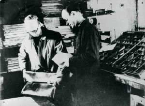Illegalt trykkeri i København, hvor Frit Danmark blev trykt. Knud Nellemose (med briller) i trykkeriet