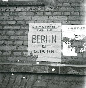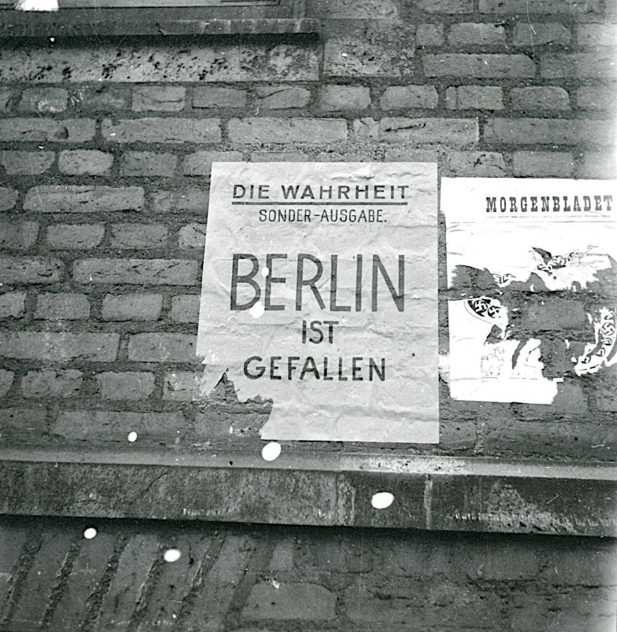 Illegal danske plakat på en husmur med meddelelse om Berlins fald d. 2. maj 1945 og plakat udsendt af Morgenbladet