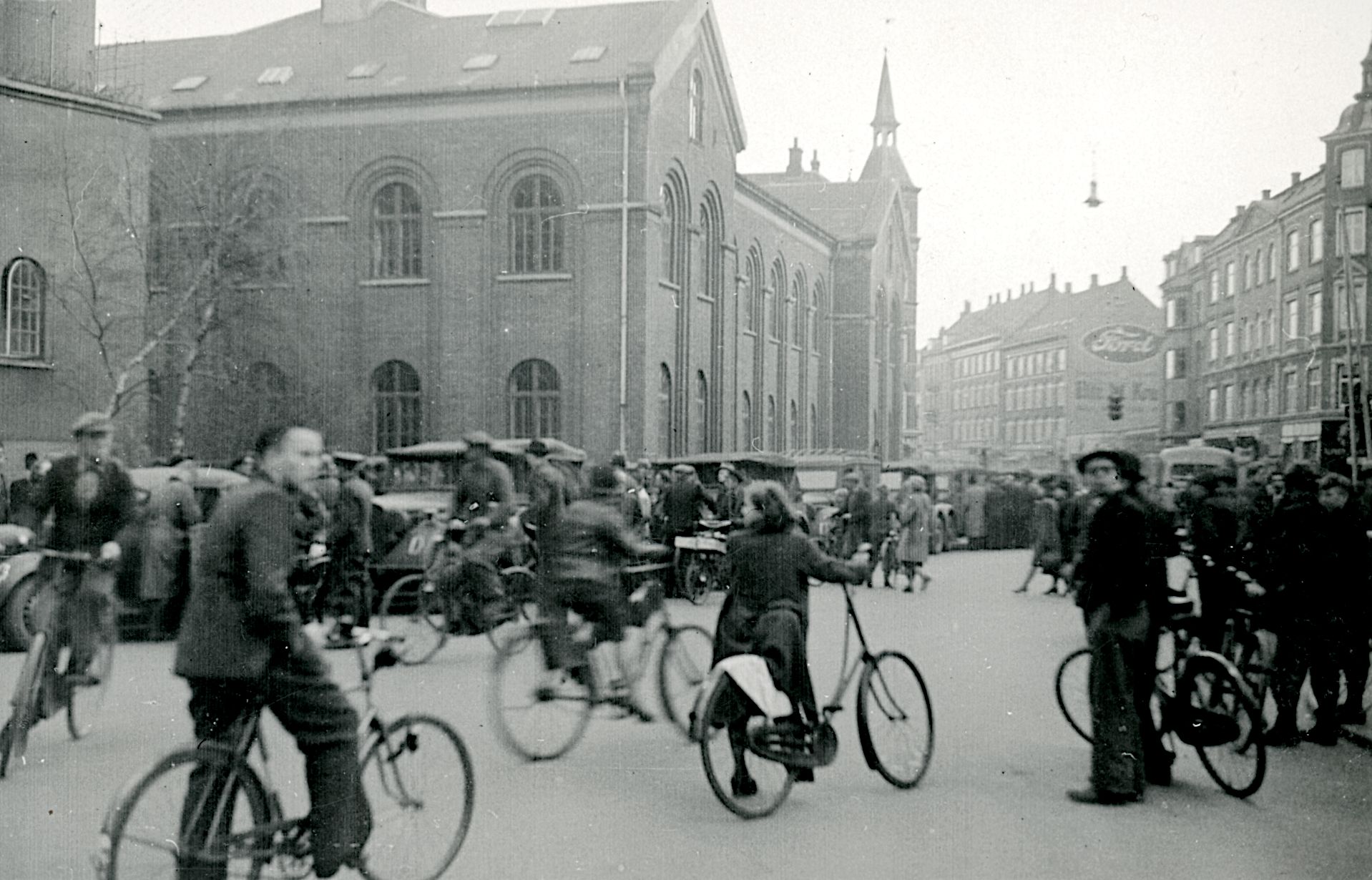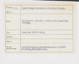 Maskingenkendt tekst fra fotokuvert: Tilskuere udenfor offentlig bygning. Ålborg.