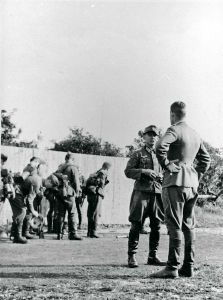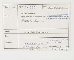 Maskingenkendt tekst fra fotokuvert: Holbæk Kaserne. Tysk soldat i samtale med intetneret soldat.