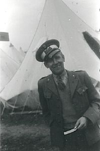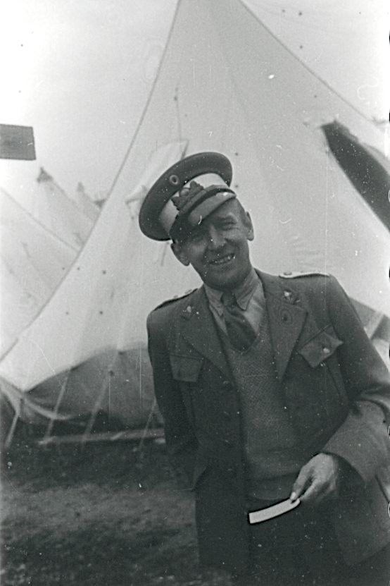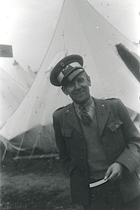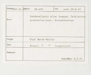 Maskingenkendt tekst fra fotokuvert: Sandsynligvis efter kampen. Teltlejrer. premierløjtnant. Holbæk Kaserne