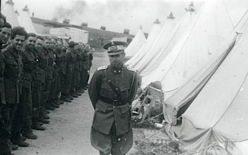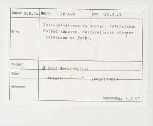 Maskingenkendt tekst fra fotokuvert: Kaptajnløjtnant og menige. Teltlejren. Holbæk Kaserne. Sandsynligvis efter at indsatsen er forbi.