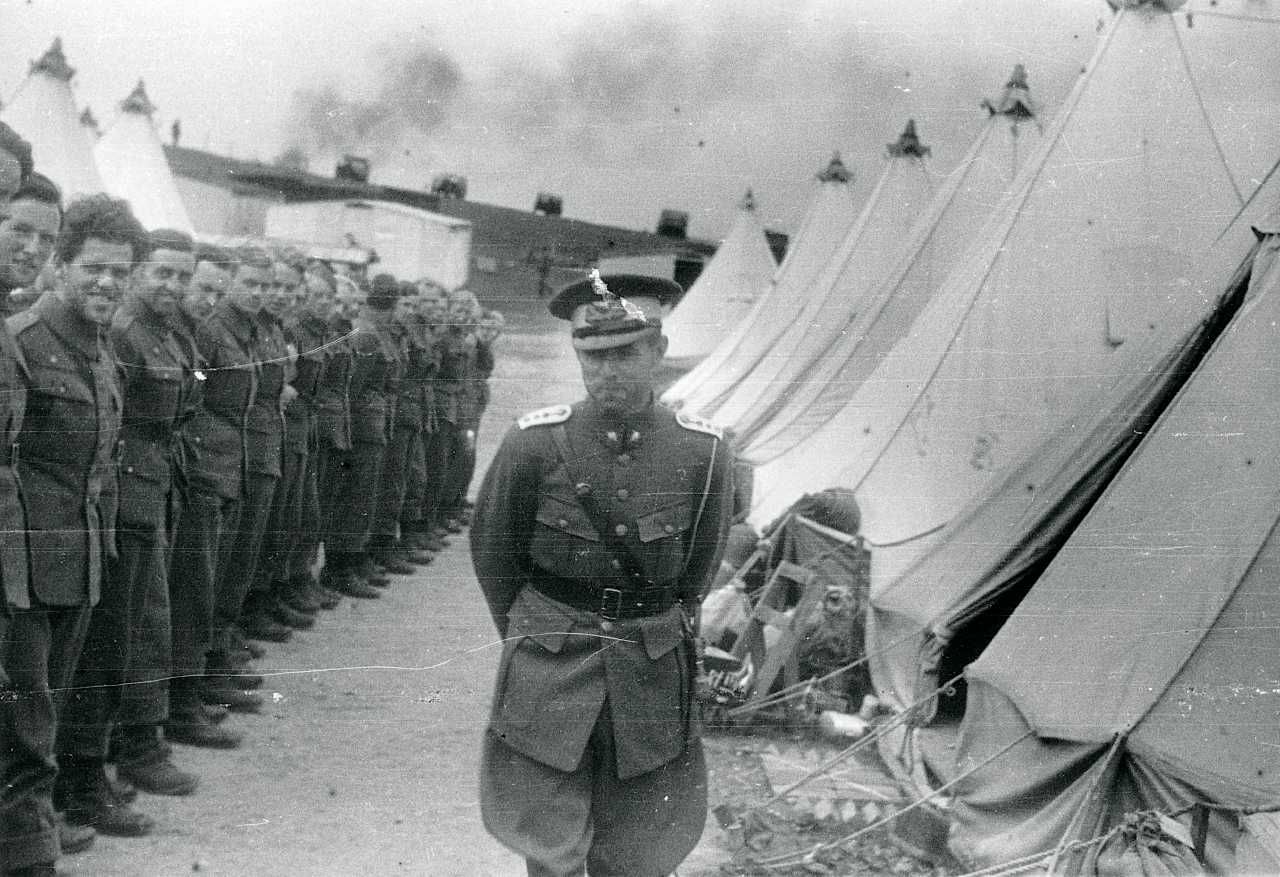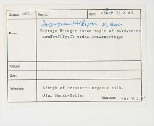 Maskingenkendt tekst fra fotokuvert: Kaptajn Hedager foran nogle af soldaterne