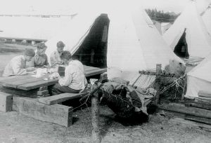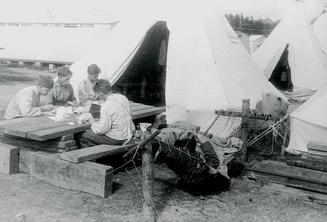 Maskingenkendt tekst fra fotokuvert: Jægerspris teltlejren. Frokosten indtages.