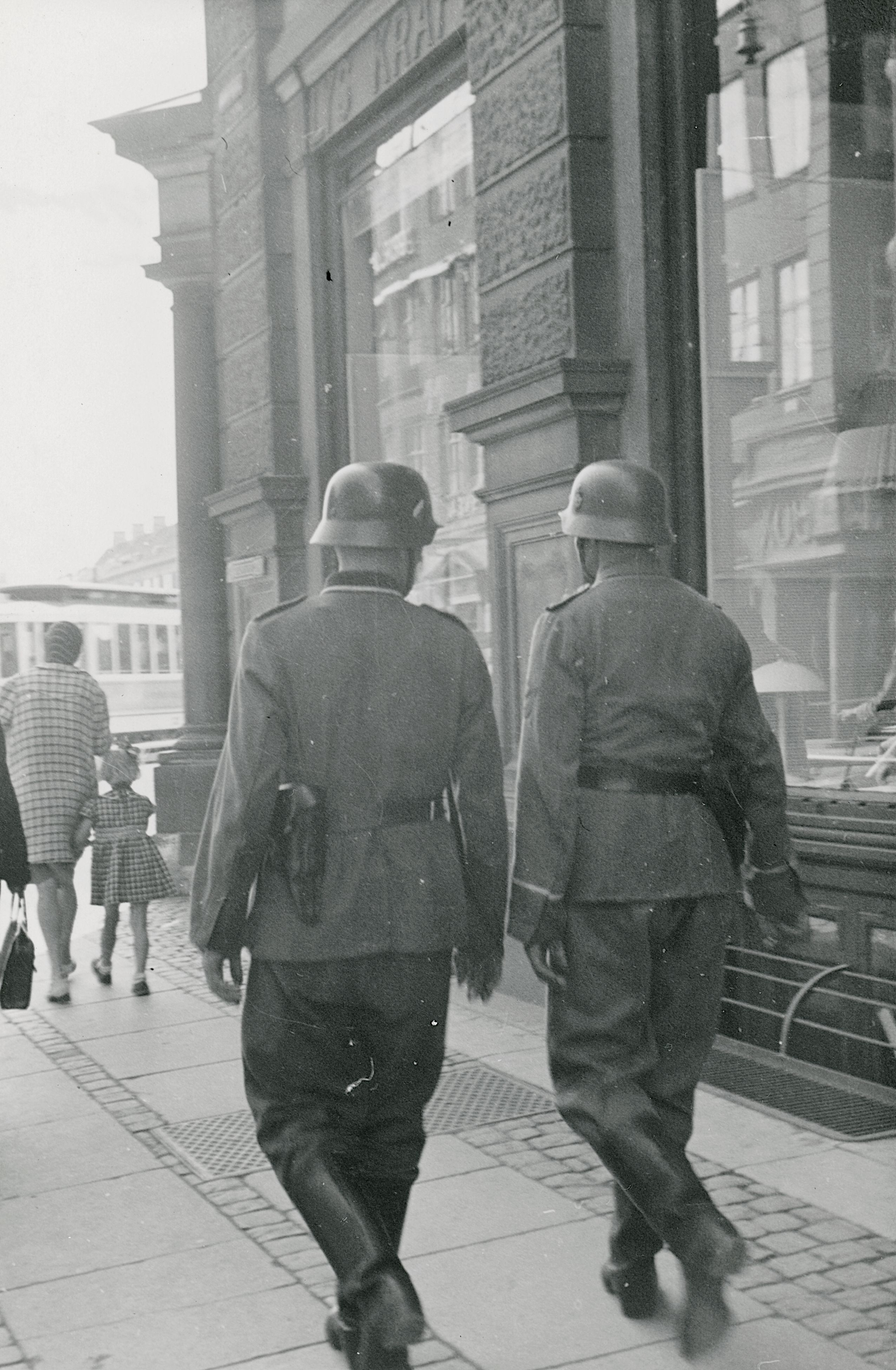Maskingenkendt tekst fra fotokuvert: Optakt til det tyske overfald d. 29/8 43 Tyske dobbeltvagter er begyndt at patrouliere i byens gader. (Gothersgade)