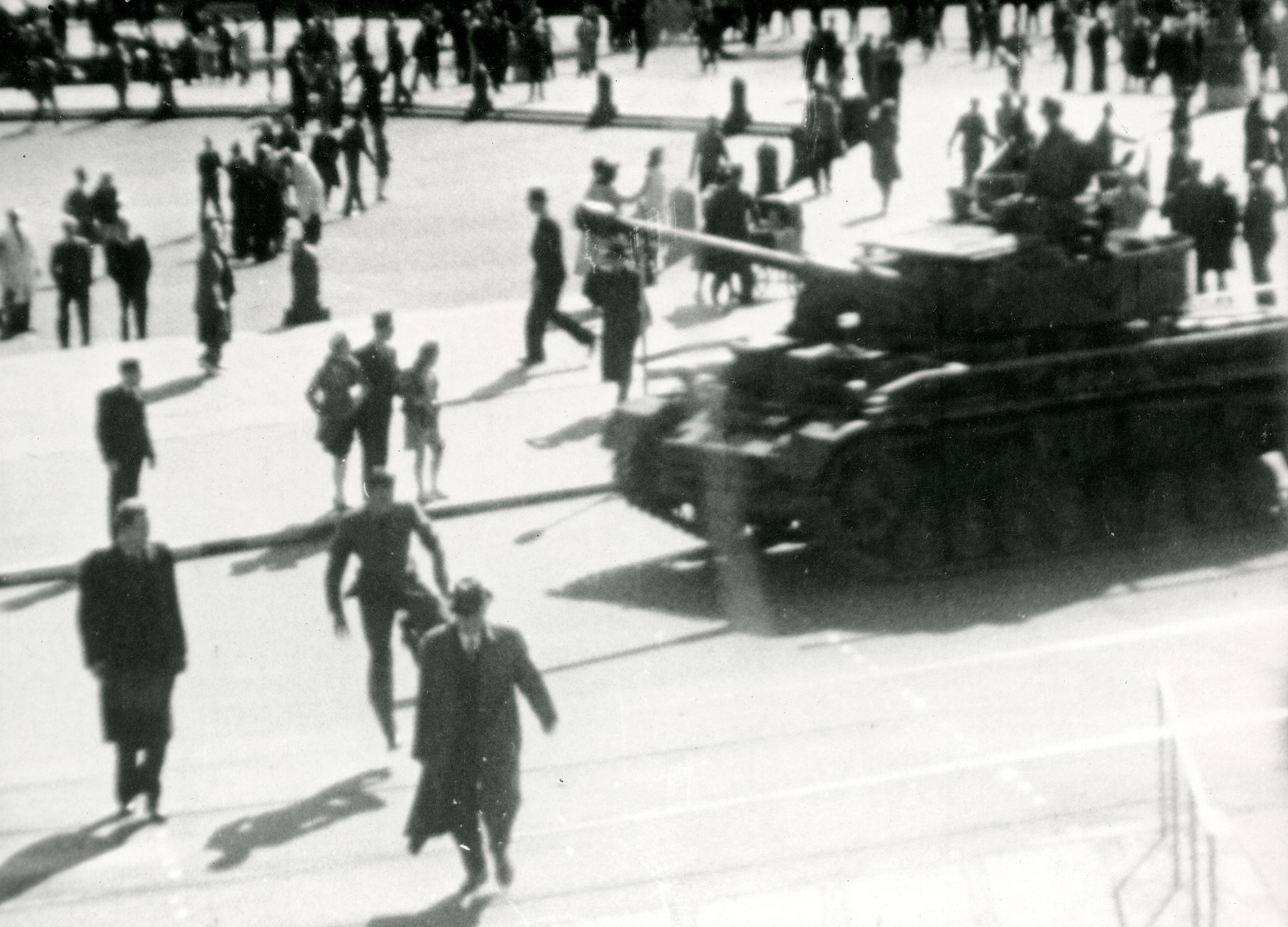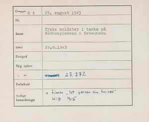 Maskingenkendt tekst fra fotokuvert: Tyske soldater i tanks på Rådhuspladsen i København