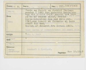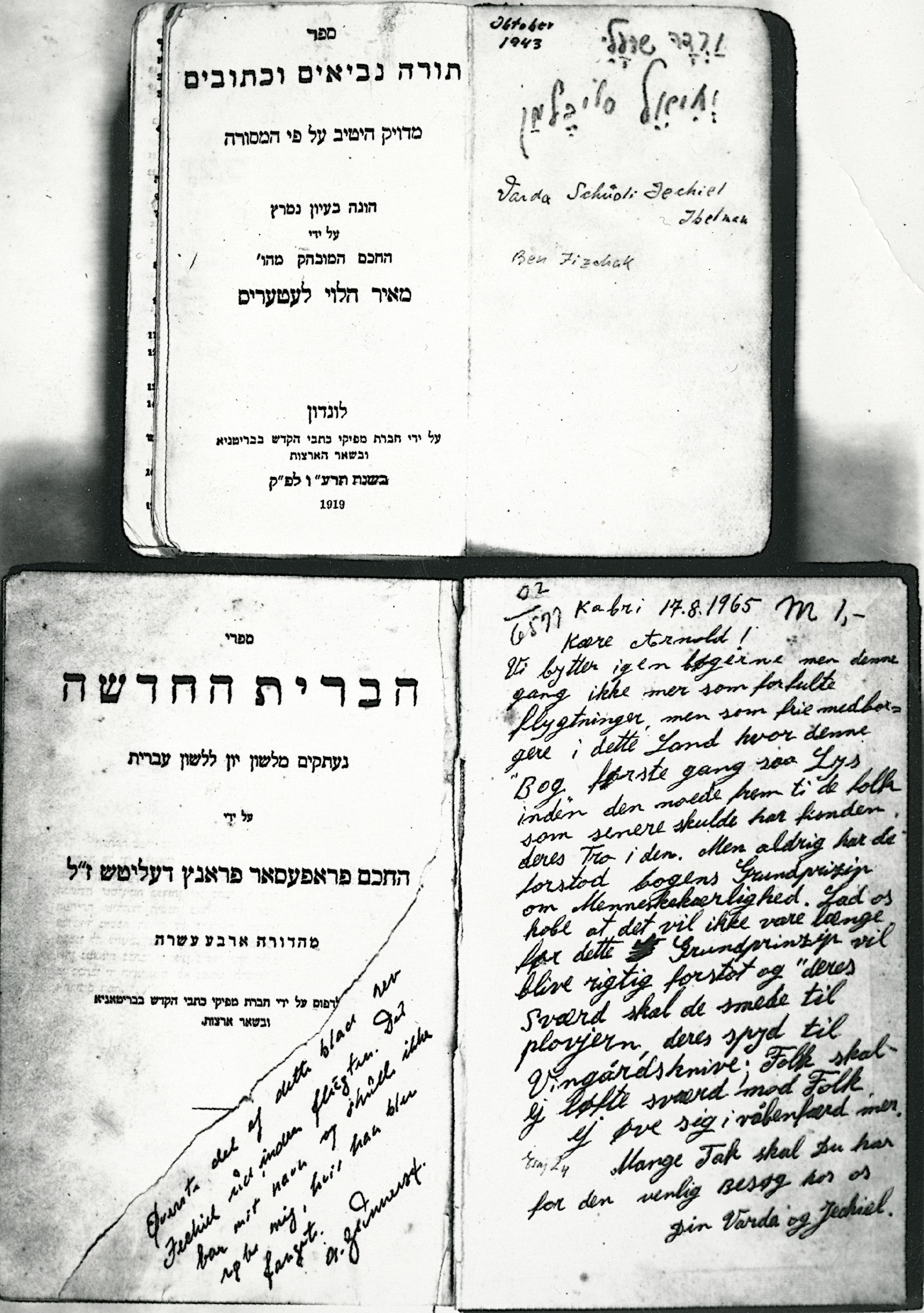 Varda og Scuoli og Jechiel Ibelman sender i 1965 den nederste hebraiske bog til Arnold Ge(d)nnerst med brev på en af bogens sider. Øverst deres hebraiske bog med dato okt. 1943, som Arnold må formodes at have sendt til dem. Brevet er dateret fra Israel 1965.
