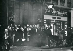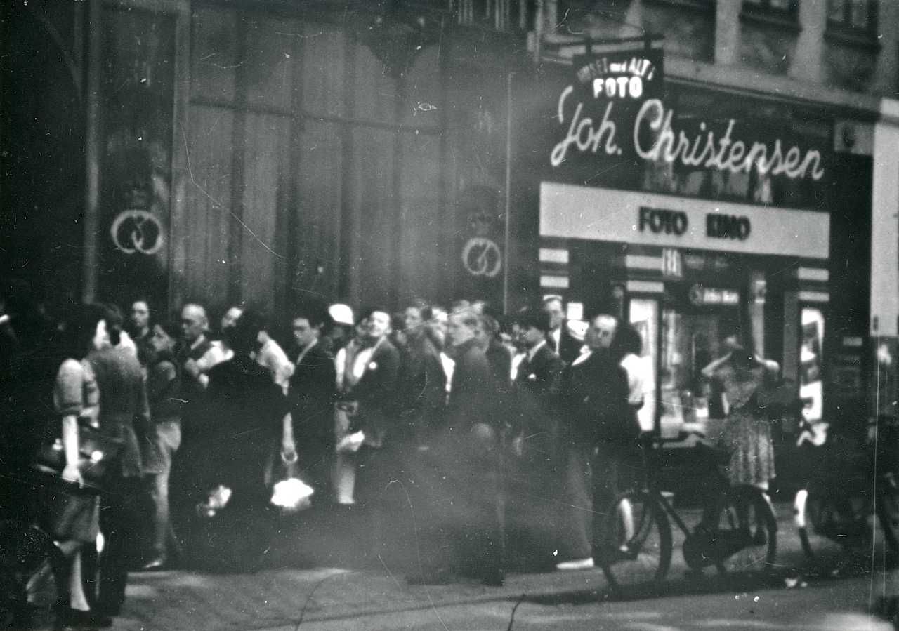 Kø foran bagerforretning i Store Kongensgade under folkestrejken i 1944 i København