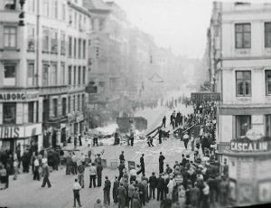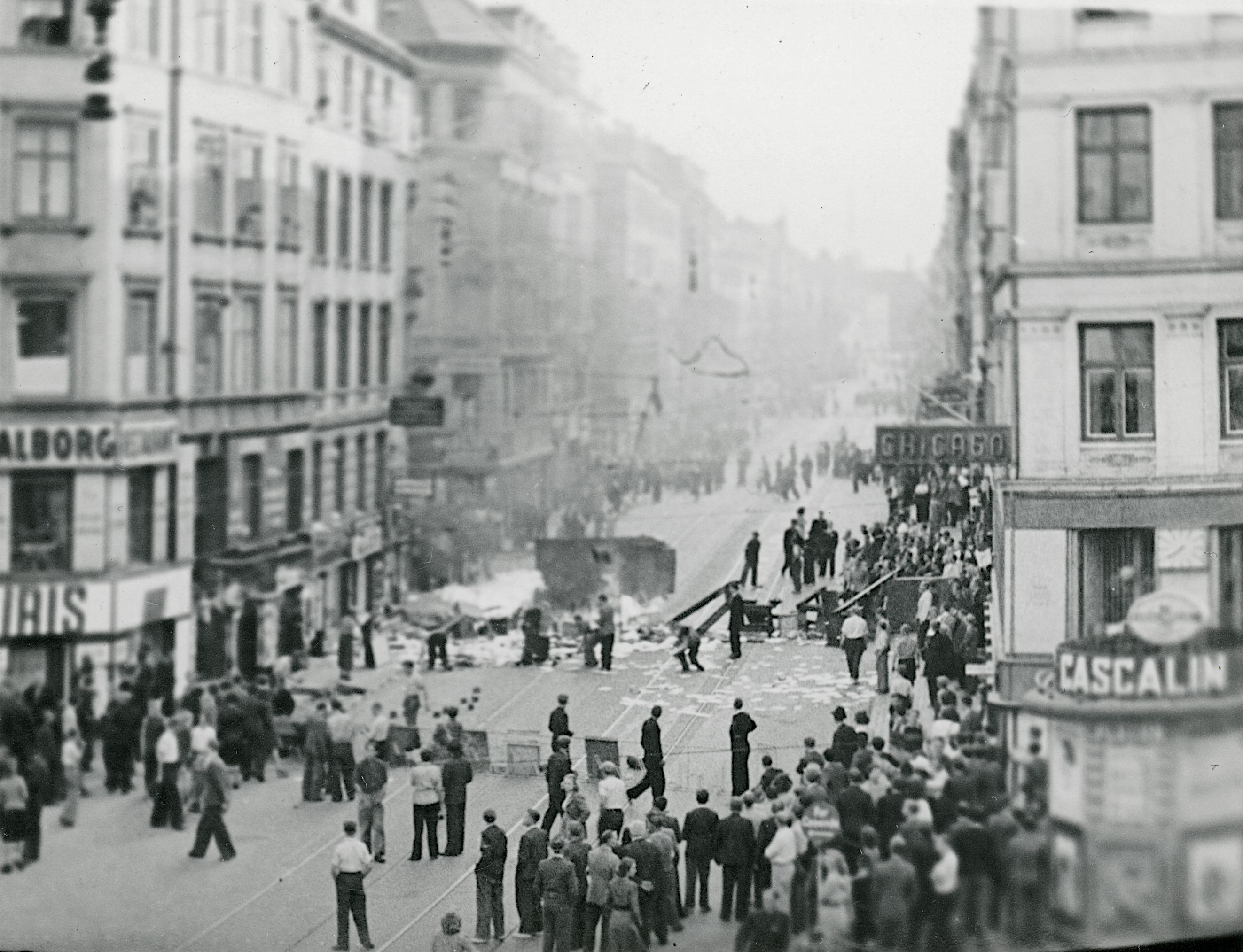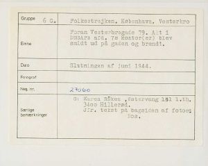 Maskingenkendt tekst fra fotokuvert: Foran Vesterbrogade 79. Alt i DNSAPs afd. 7s kontor(er) blev smidt ud på gaden og brændt.