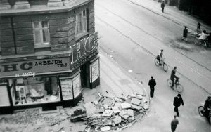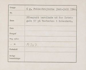 Maskingenkendt tekst fra fotokuvert: Påbegyndt barrikade ud for Istedgade 57 på Vesterbro i København.