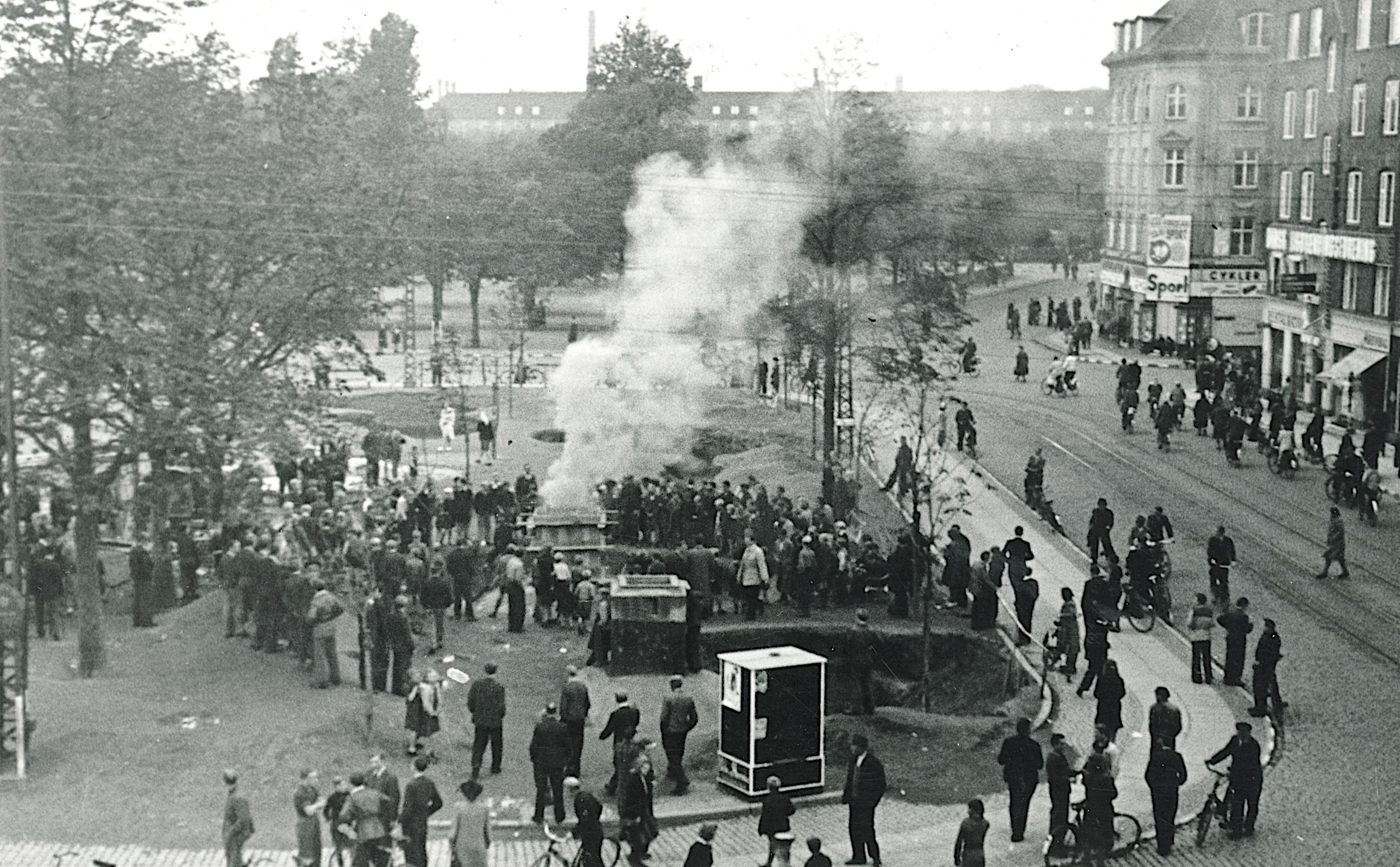 Maskingenkendt tekst fra fotokuvert: Bål på Enghave Plads i København.