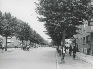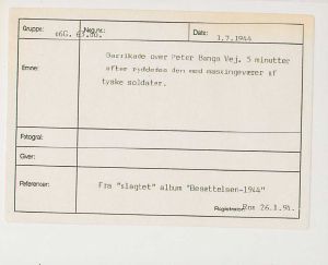 Maskingenkendt tekst fra fotokuvert: Barrikade over Peter Banqs Vej. 5 minutter efter ryddedes den med maskingeværer af tyske soldater.