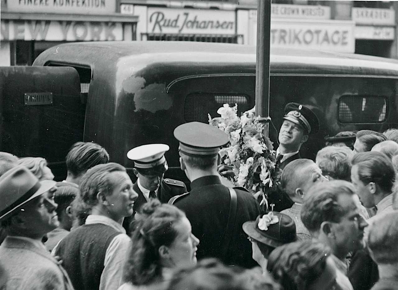 Folkestrejken i København 1944. Politibetjente fjerner blomster, der er anbragt ved Nørrebrogade 53.