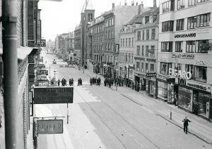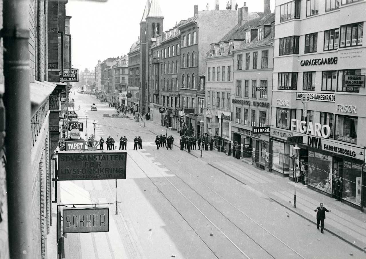Dansk politi står klar til at rydde den store barrikade på Nørrebrogade i København under folkestrejken i 1944
