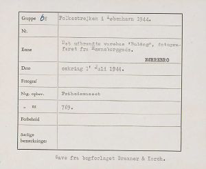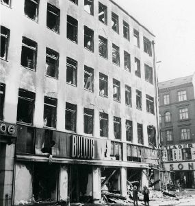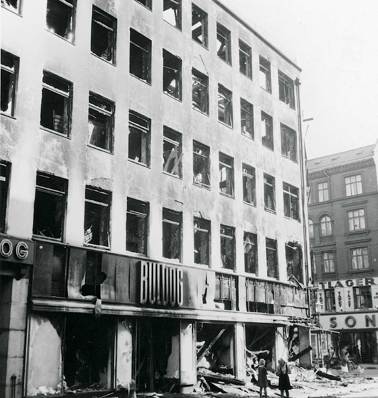 Maskingenkendt tekst fra fotokuvert: Det udbrændte varehus "Buldog", fotograferet fra avnsborggade.