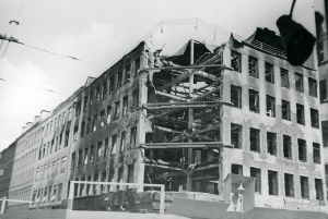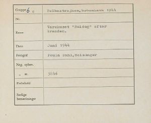 Maskingenkendt tekst fra fotokuvert: Varehuset "Buldog" efter branden.
