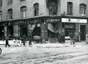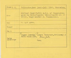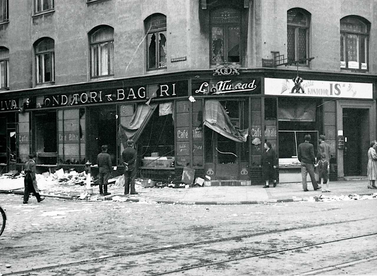 Maskingenkendt tekst fra fotokuvert: Ødelagt bagerbutik på hjørnet af Baggesensgade og Wesselsgade (bagermester O.Rasmussen). Wesselsgade nr. 2.