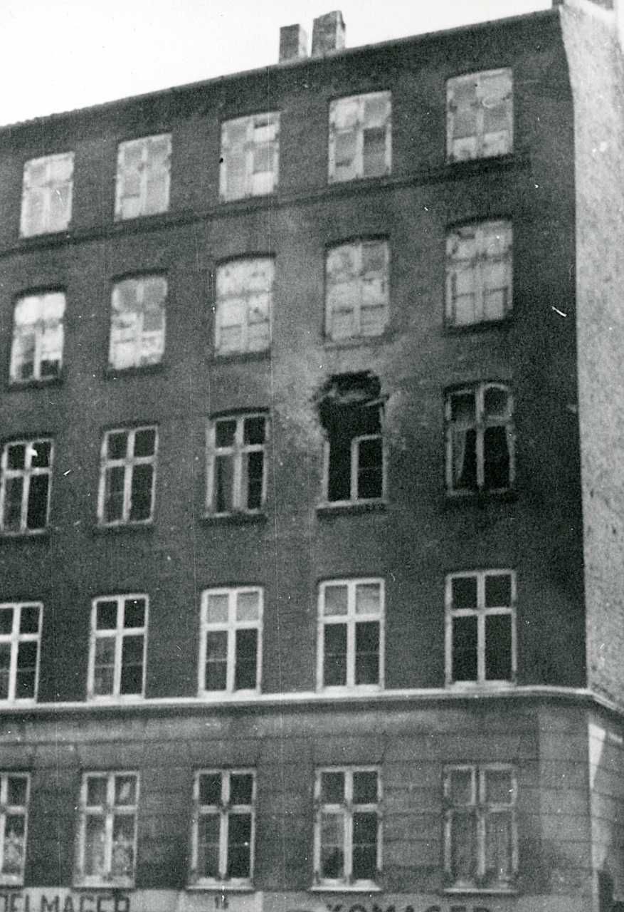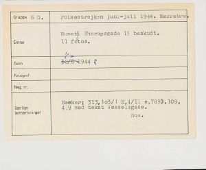 Maskingenkendt tekst fra fotokuvert: Huset i Thorupsgade 15 beskudt.