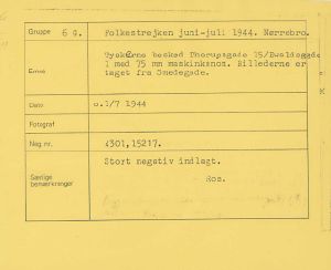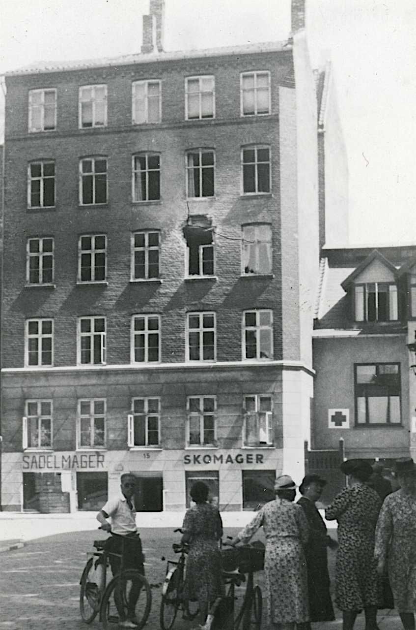 Fra folkestrejken i København. Ejendommen Thorupsgade 15 efter beskydning med tysk 75 mm maskinkanon. En kvindelig beboer i den ramte lejlighed blev dræbt.
