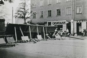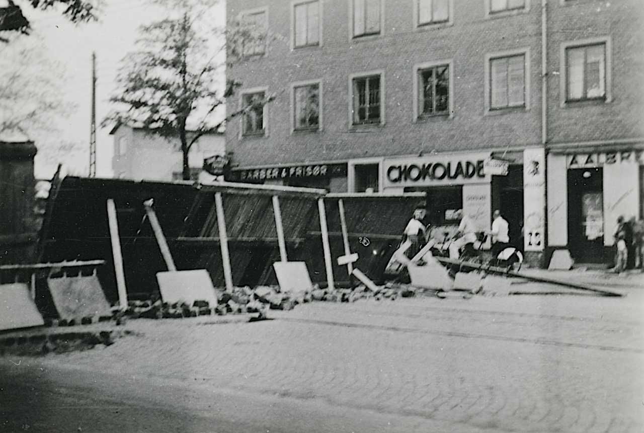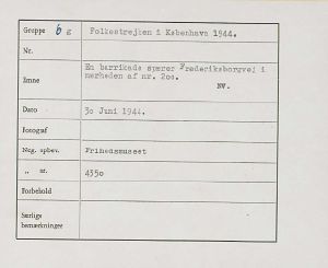 Maskingenkendt tekst fra fotokuvert: En barrikade spærer Frederiksborgvej i nærheden af nr. 200. NV.