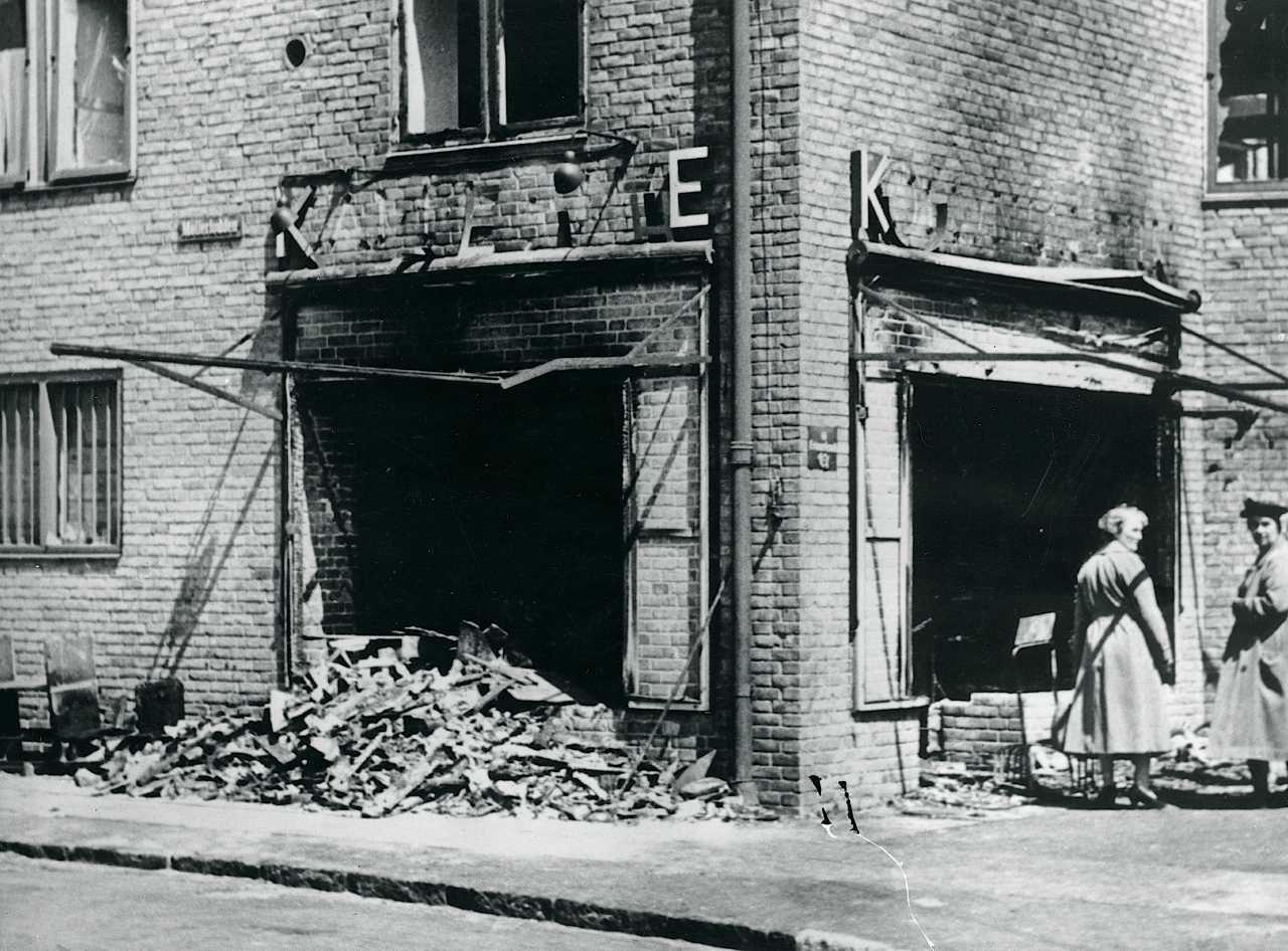 Kolonialforretning på Tomsgårdsvej raseret og afbrændt af demonstranter under folkestrejken i København i 1944