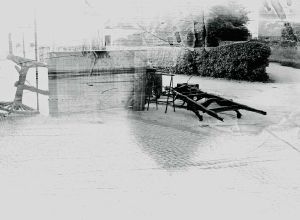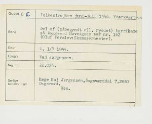 Maskingenkendt tekst fra fotokuvert: Del af (påbegyndt ell. ryddet) barrikade på Bagsværd Hovedgade nær nr. 162 (Oluf Ferslevr Skomagermester).