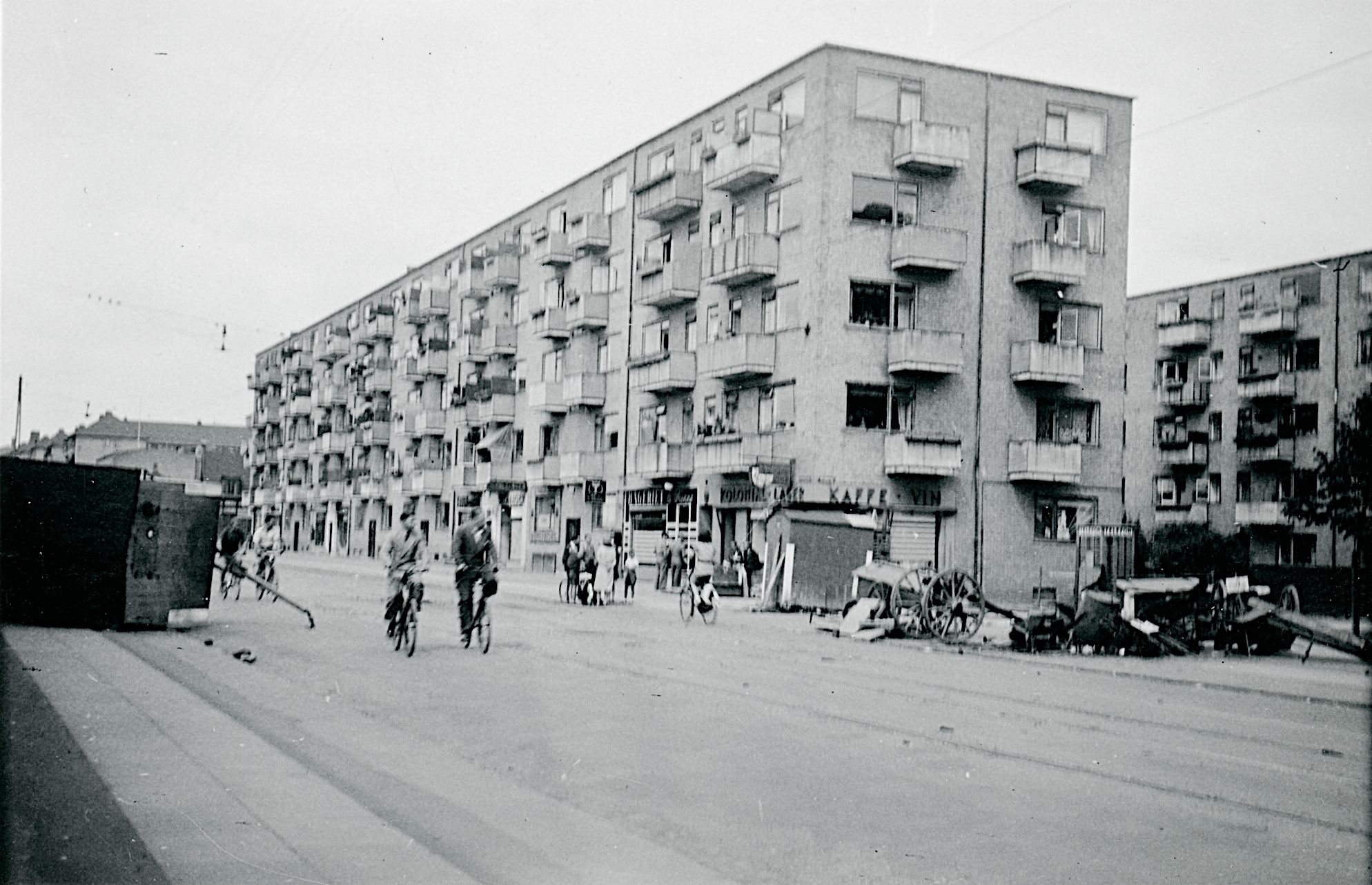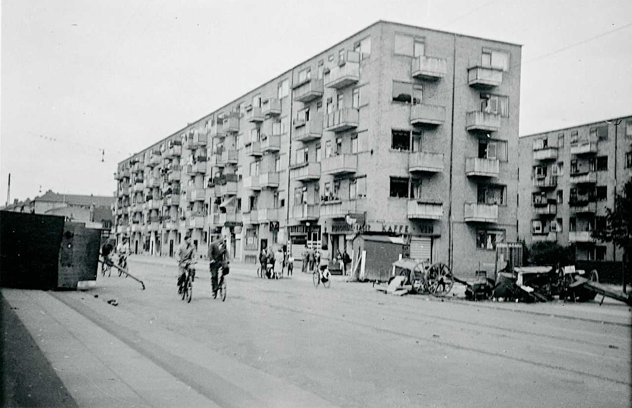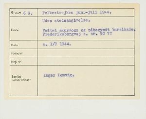 Maskingenkendt tekst fra fotokuvert: Uden stedsangivelse. Væltet skurvogn og påbegyndt barrikade Frederiksborgvej o. nr. 50