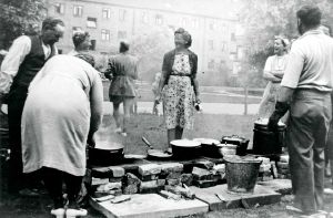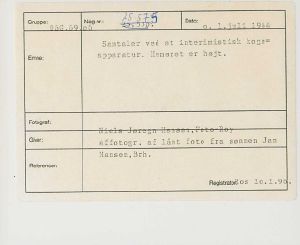Maskingenkendt tekst fra fotokuvert: Samtaler ved et intermistisk koge-apparatur. Humøret er højt.
