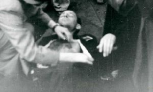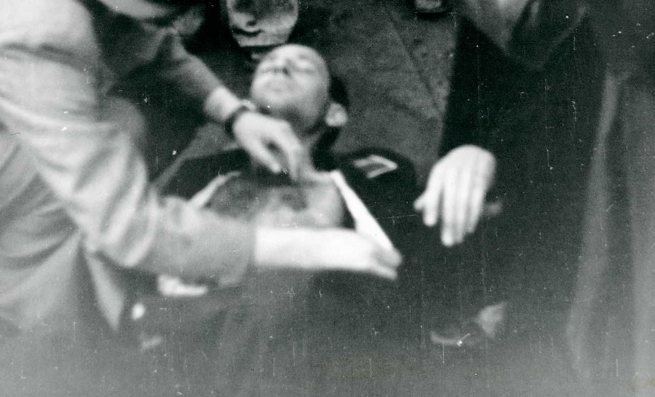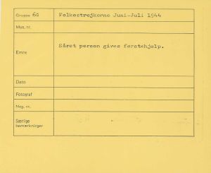 Maskingenkendt tekst fra fotokuvert: Såret person gives førstehjælp.