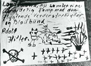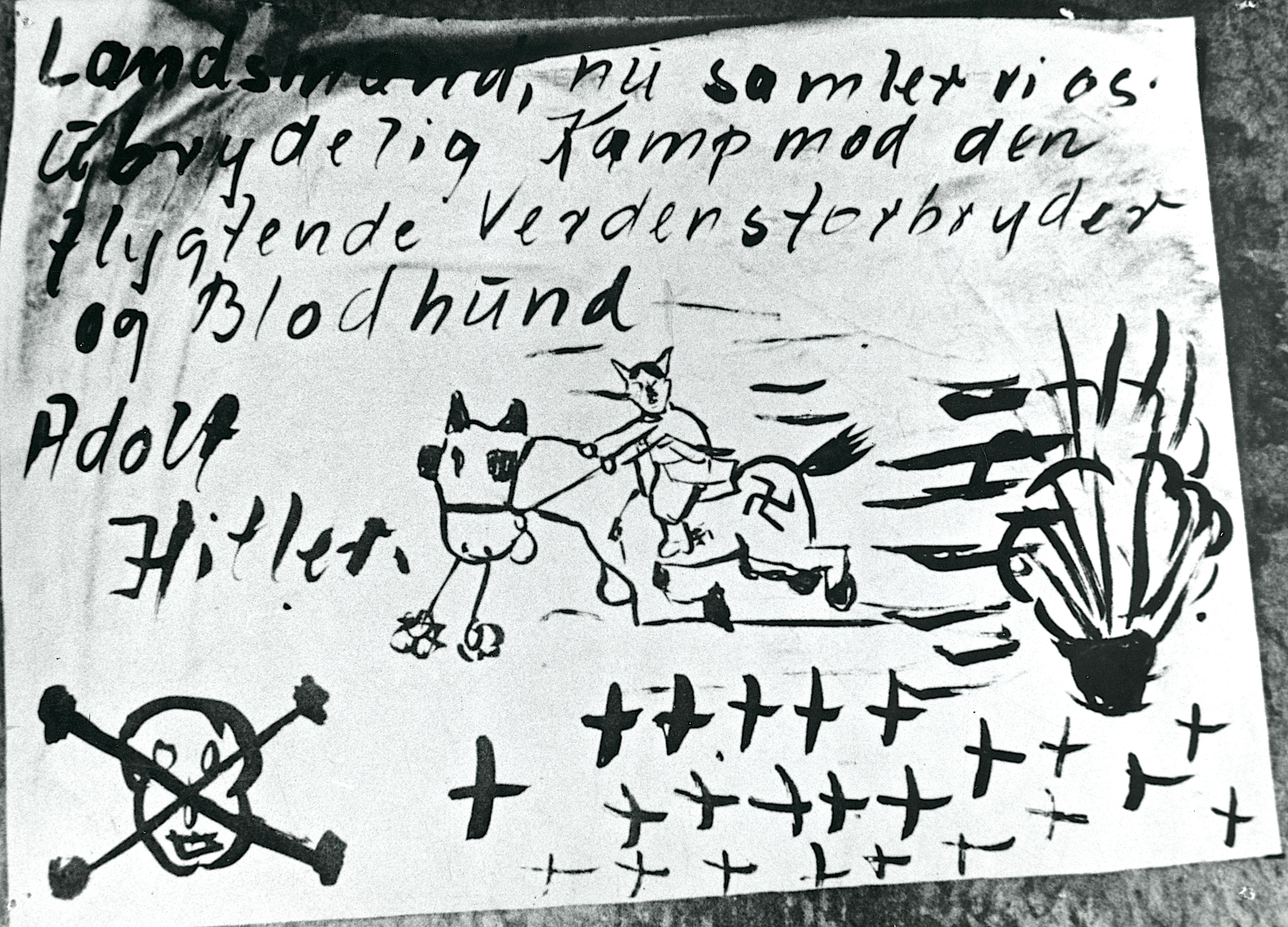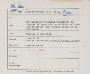 Maskingenkendt tekst fra fotokuvert: En plakat af en ukendt "kunstner" opfordrer til kamp mod forbryderen og blodhunden Hitler (har vistnok siddet på en barrikade).