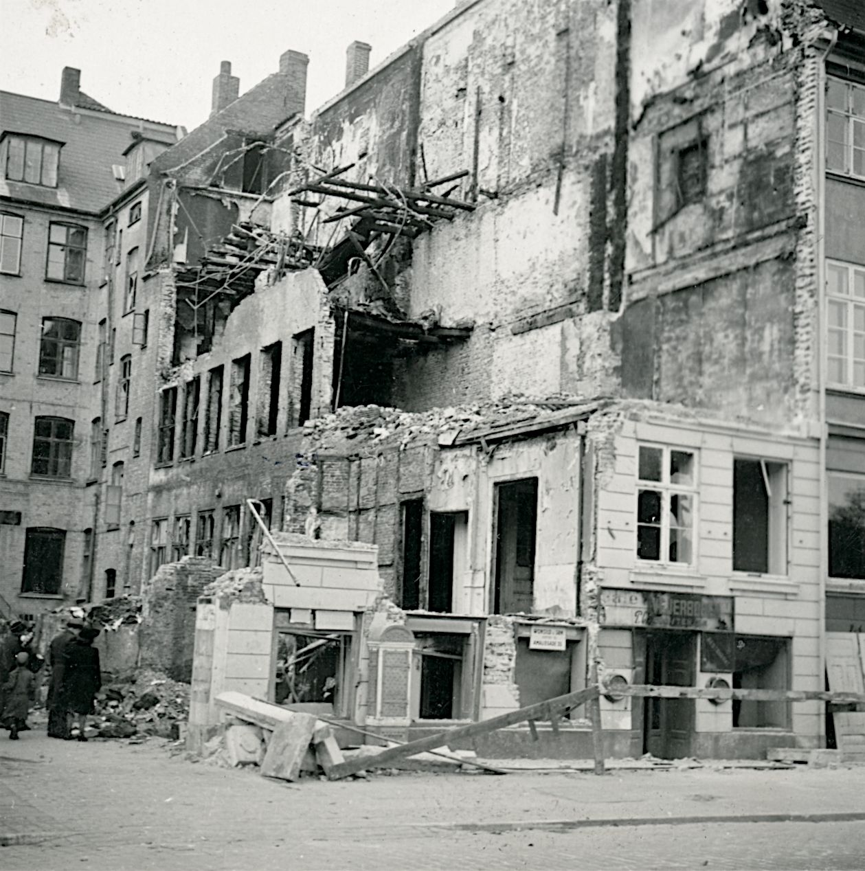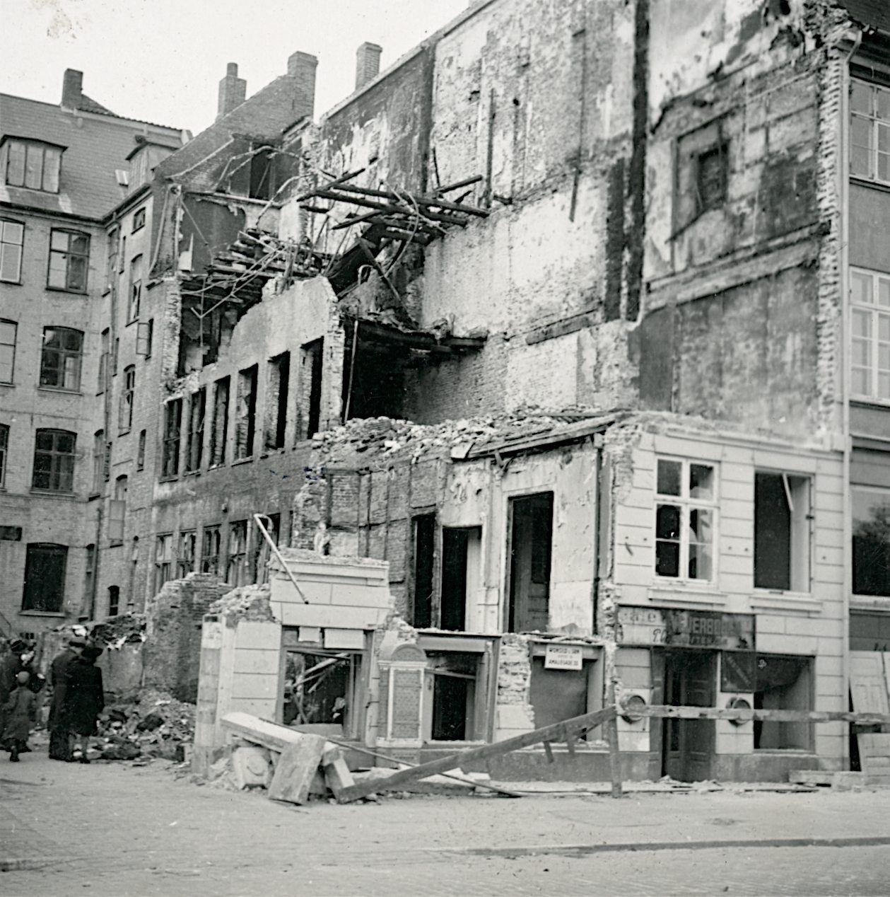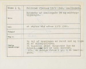 Maskingenkendt tekst fra fotokuvert: Ruinerne af Amaliegade 39 og sidebygbygningen.
