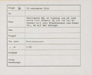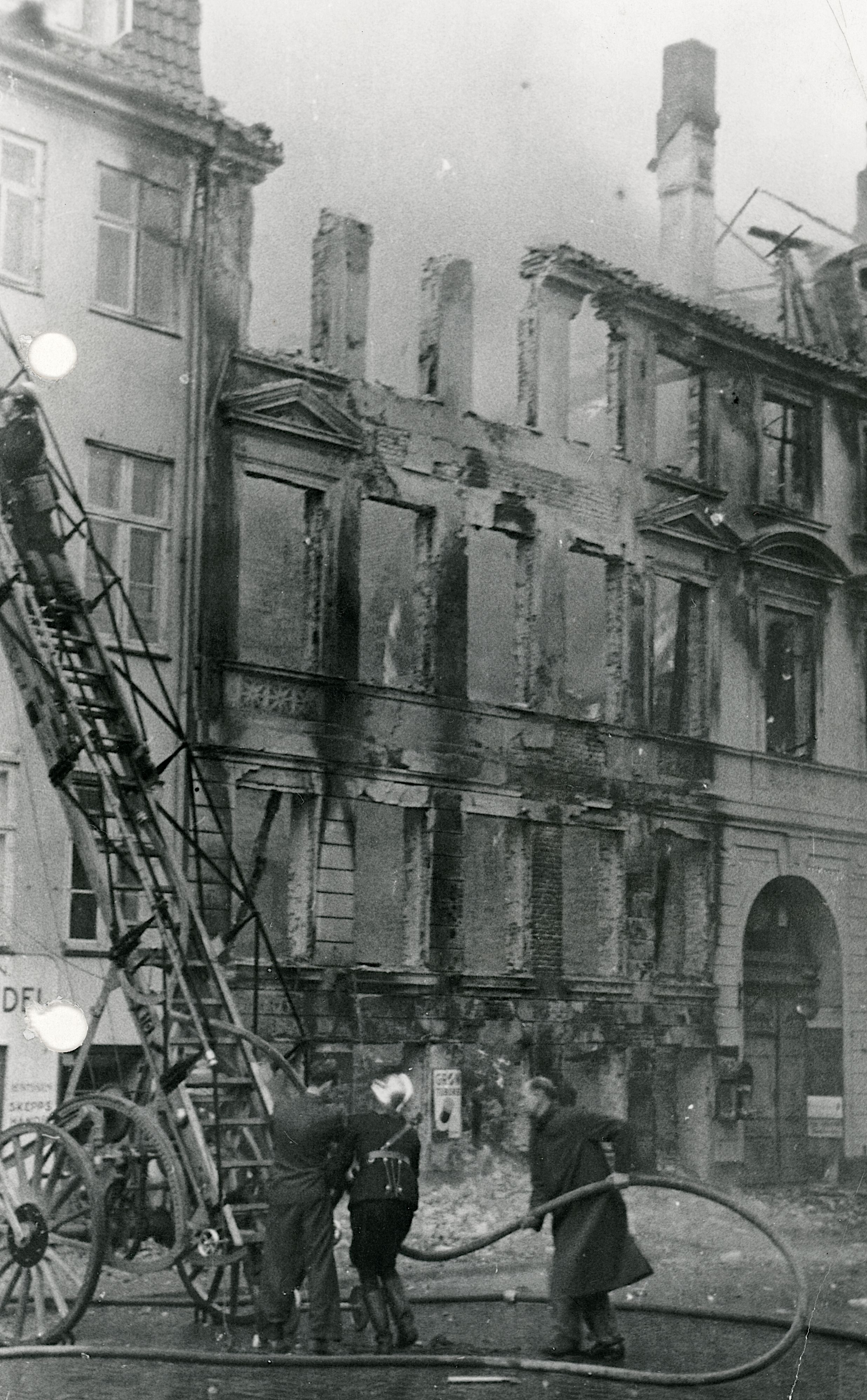 Brændende bygning i Amaliegade under kampene ved Amalienborg i forbindelse med aktionen mod politiet d. 19. september 1944