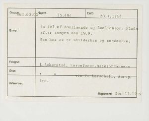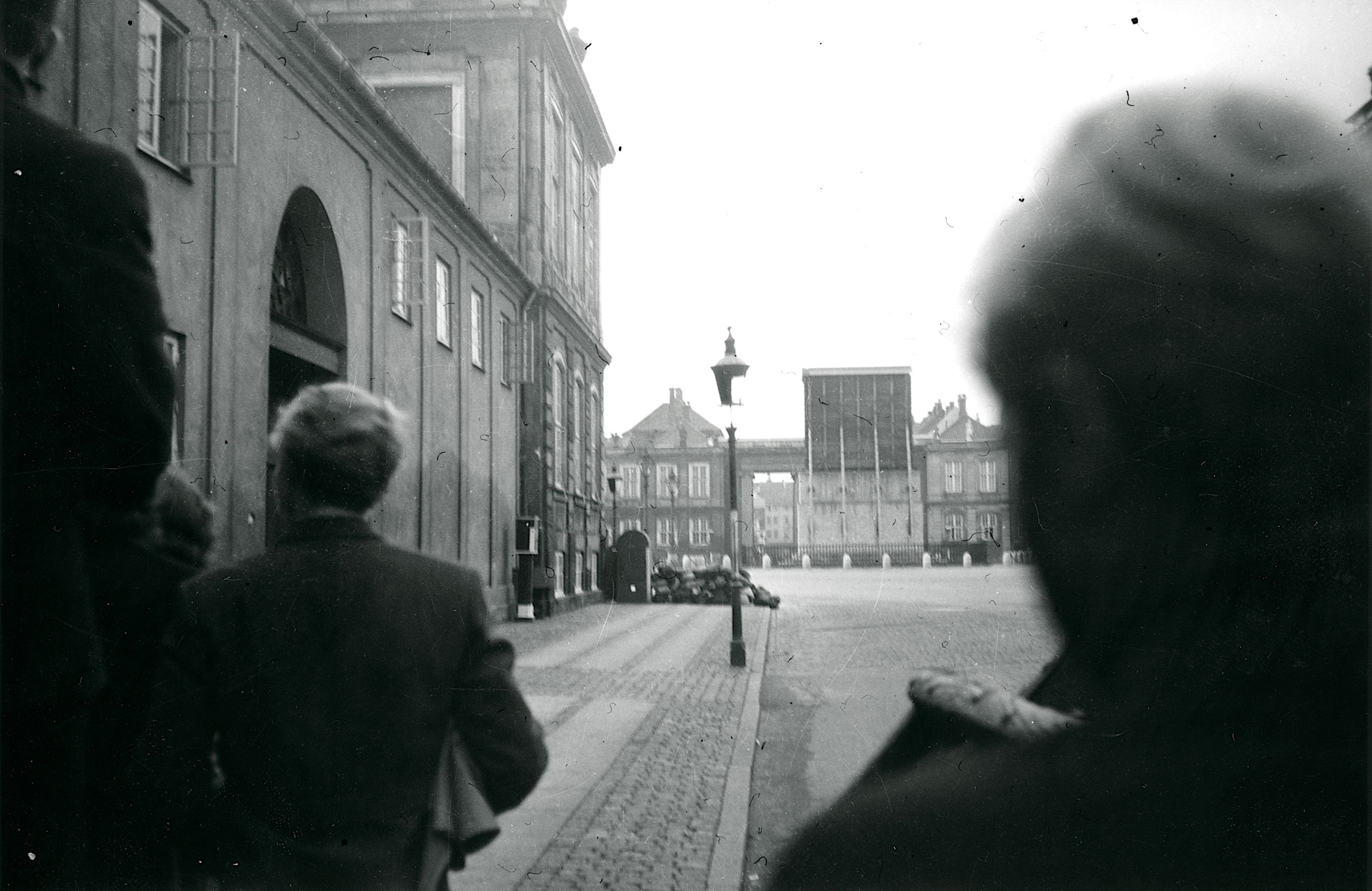 Maskingenkendt tekst fra fotokuvert: En del af Amaliegade og Amalienborg Plads efter kampen den 19.9. han kan se et skilderhus og sandsække.