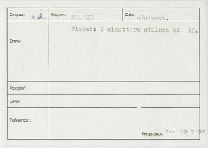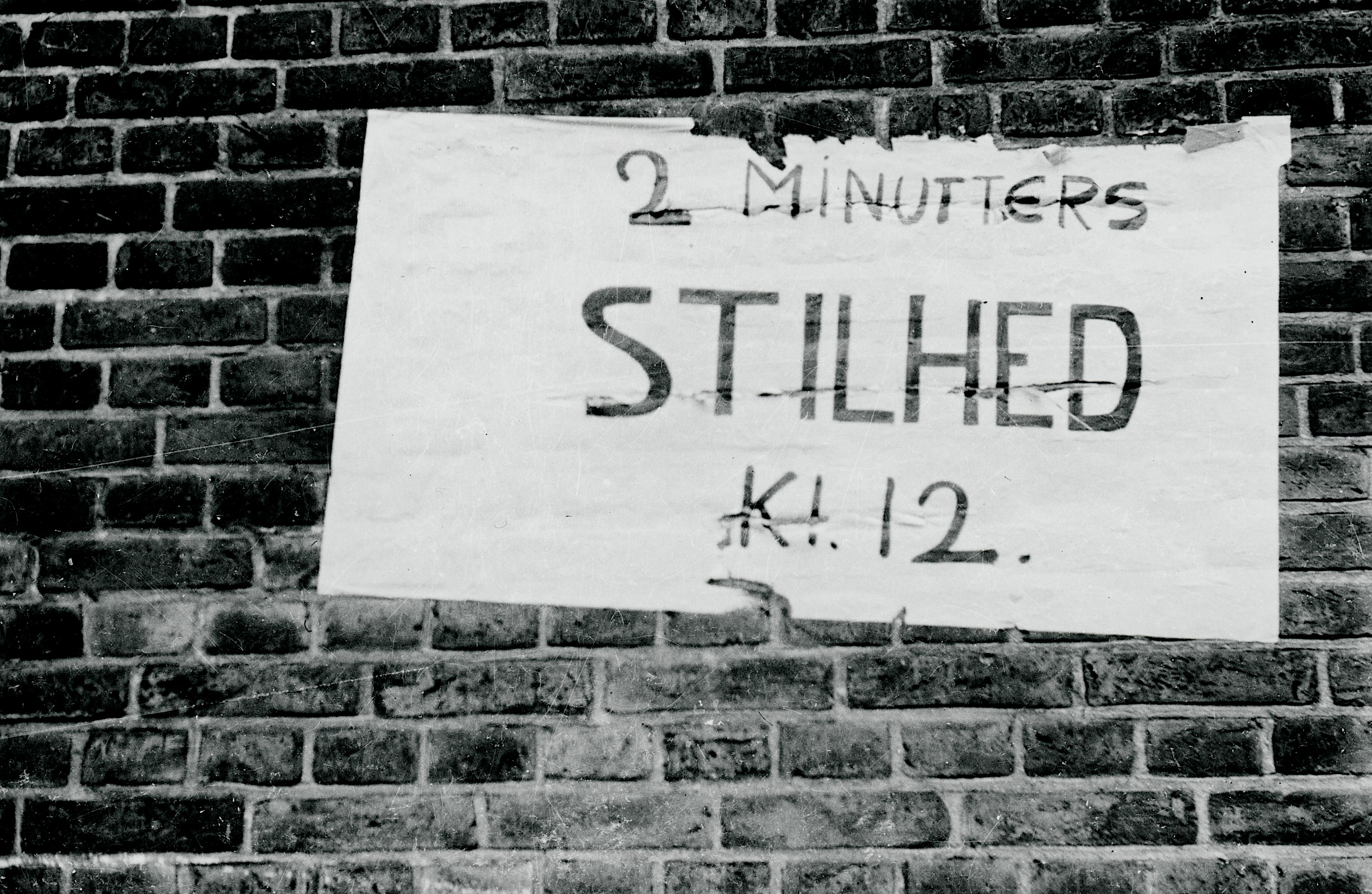 Maskingenkendt tekst fra fotokuvert: Plakat 2 minutters stilhed kl. 12.