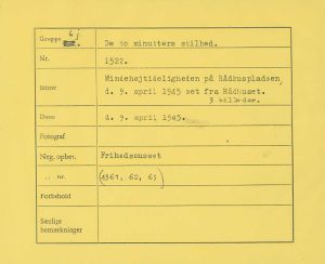Maskingenkendt tekst fra fotokuvert: Mindehøjtideligheden på Rådhuspladsen d. 9. april 1945 set fra Rådhuset.