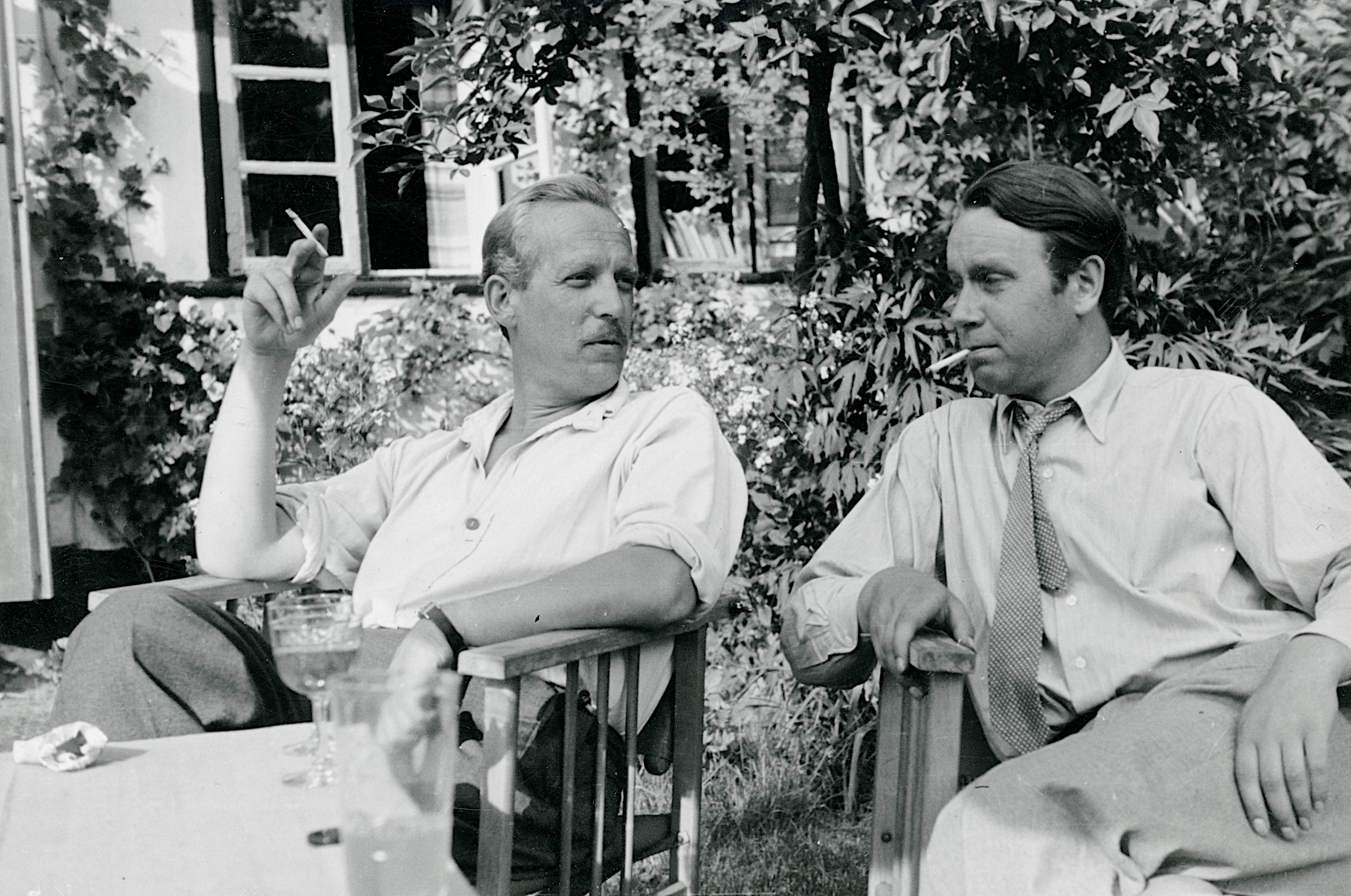 Filmarkivar Ove Brusendorffs hus i Skovlunde fungerede i sommeren 1944 som refugium for en række intellektuelle, som levede helt eller delvis under jorden. Forfatteren Kjeld Abell (camoufleret med overskæg) og Ove Brusendorff.