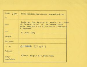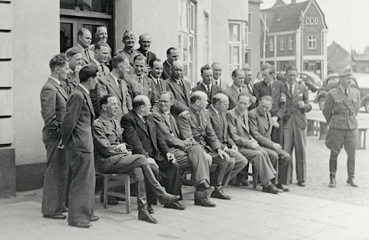 Modstandsbevægelsens byledere for region II (Midtjylland) samlet til møde på Brande Hotel d. 6. maj 1945. Midt på forreste række (i uniform) regionslederen, oberst C.C. Larsen