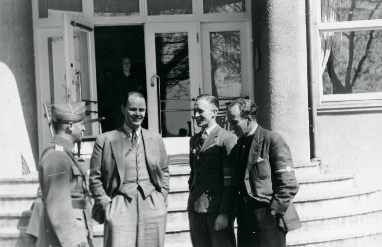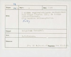 Maskingenkendt tekst fra fotokuvert: I midten regionsledelsens repræsentant Jens Kruse (region III). De øvrige uidentificerede.